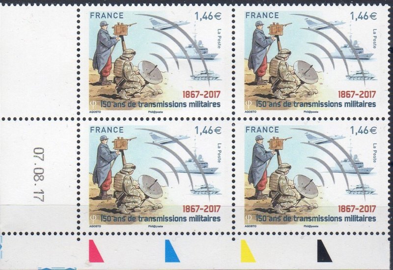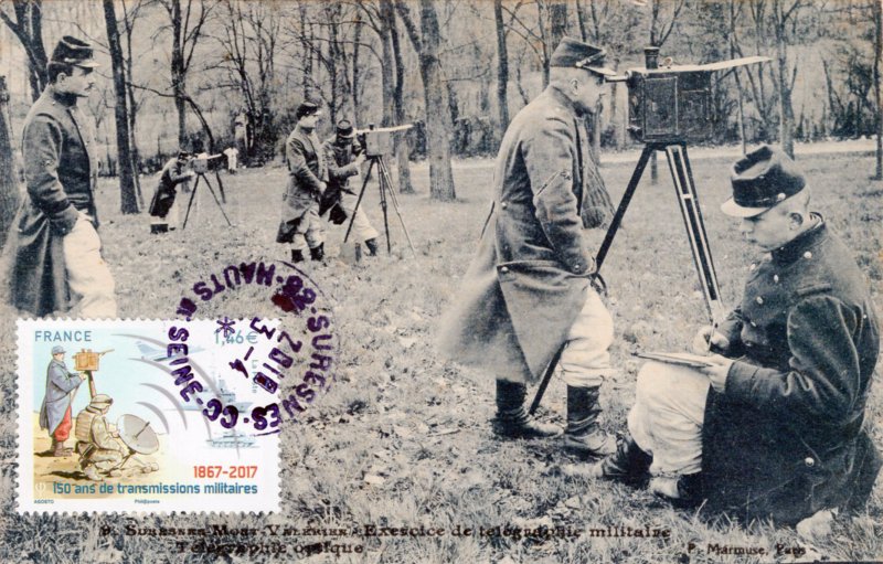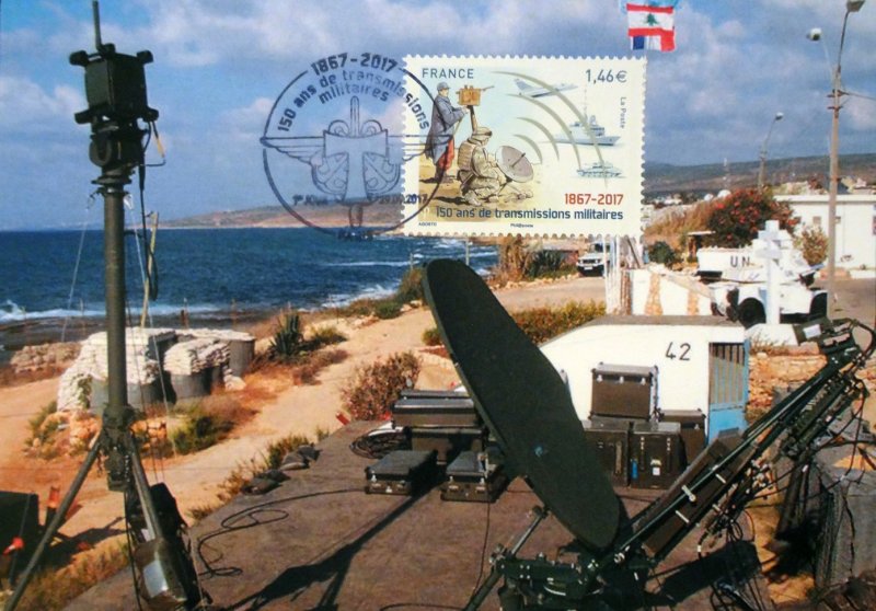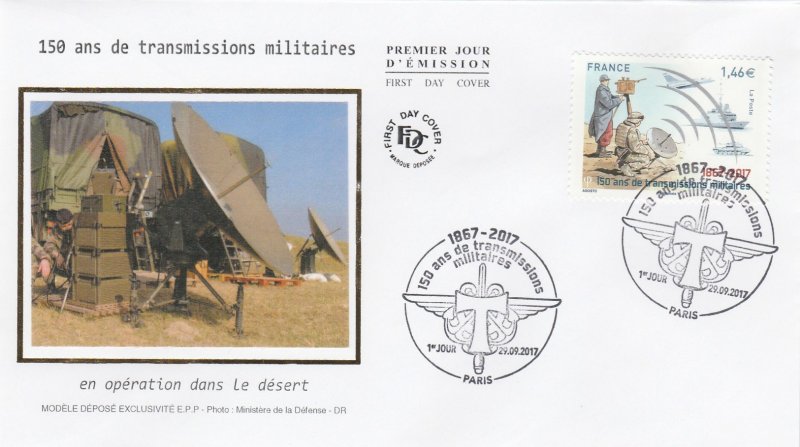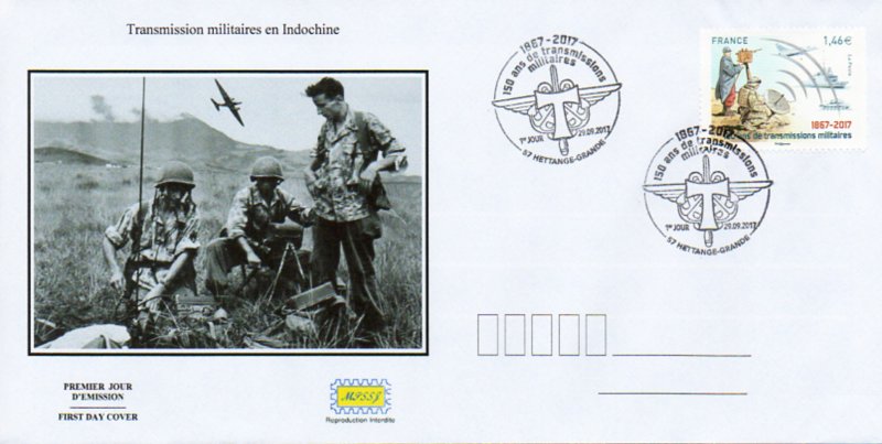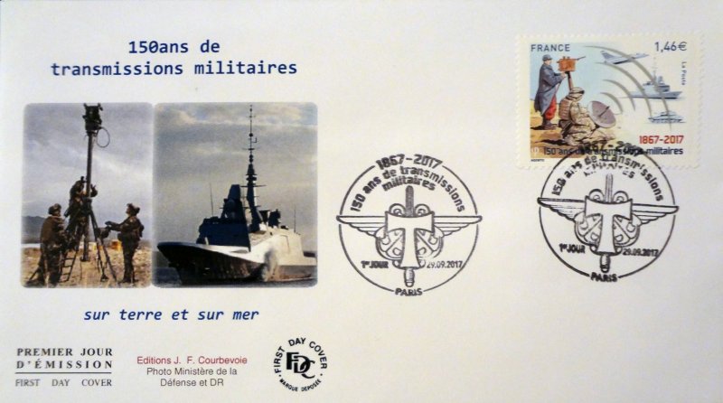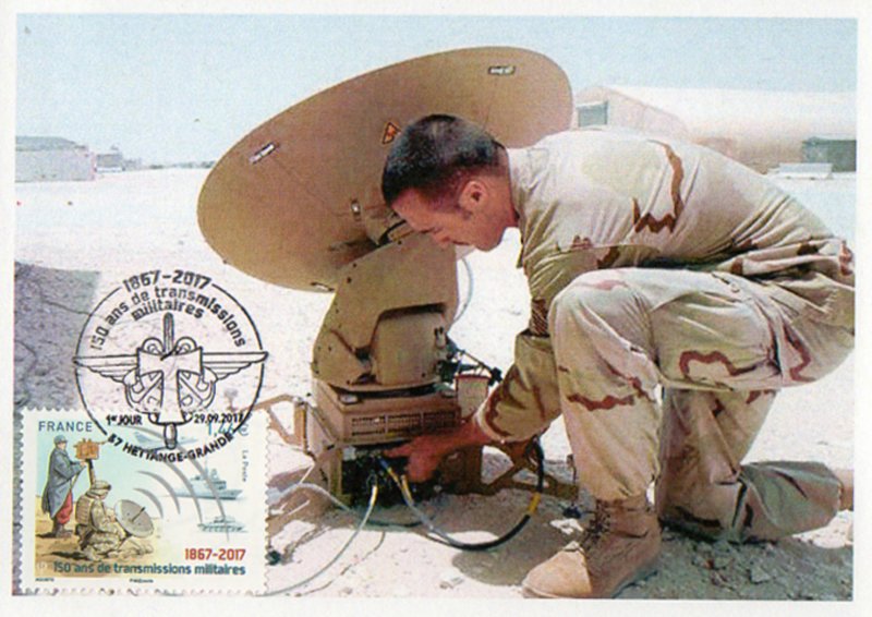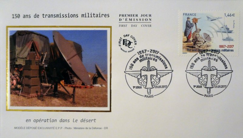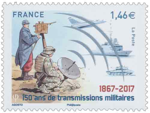 | Commentaire | Visuel : dès transmissions de 1867, aux transmissions par satellites de 2017, pour les trois armes représentées par l'avion Rafale, fleuron de notre force aérienne, un croiseur de la nouvelle génération et le char Leclerc de l'armée de Terre. TàD : 1867-2017 - le logo des 150 ans de Transmissions Militaires au sein des 3 Armes : Le "T" des Transmissions, les Ailes stylisées de "l'épervier" de l'Armée de l'Air française, les Ancres de la Marine Nationale et l'Epée, symbole de l'Armée de Terre. |