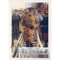 | Commentaire | Vignette d'affranchissement LISA 2 Visuel : le portrait du général John Joseph PERSHING (1860-1948) et les drapeaux américain et français. Le 28ème Régiment d’Infanterie Américain, en pause du déjeuner à Gondrecourt (55). Les soldats en entraînement vivent comme dans les cantonnements. Le repas a lieu autour de la roulante - Gondrecourt, 15.10.1917 © Signal Corps |