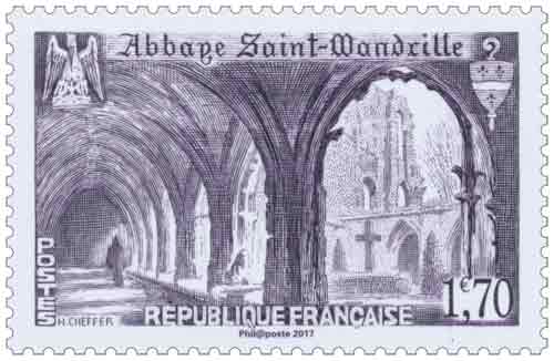 | Commentaire | Provenant du Bloc de 5 TP trésors de la philatélie 2017 Visuel : le cloître de l'abbaye (vers 1949) – le "Pélican symbolique" en pierre sculptée, situé au dessus de la porte d'accès (XVe s.) à l'avant-cour des bâtiments (à gauche) et le blason de la Porte de Jarente XVIIIe s. (à droite) Histoire : L'abbaye Saint-Wandrille, anciennement "abbaye de Fontenelle", est une abbaye bénédictine de la congrégation de Solesmes, située sur la commune de Saint-Wandille-Rançon ((Seine-Maritime - 76). Fondée vers 649 (jusqu'au XVIIIe s.), elle a connu une longue histoire, marquée par trois grandes périodes de saccages et de destructions : celles liées aux incursions des Vikings, puis celles engendrées par les guerres de religion, et enfin celles consécutives à la Révolution française. C'est encore aujourd'hui une abbaye de moines bénédictins (classée M.H. liste de 1862 / 1914 et 1995). |
