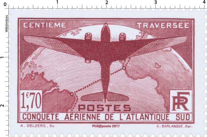 | Description | Réédition du timbre : 1936 - 100e traversée aérienne de l'Atlantique sud par les avions postaux français |