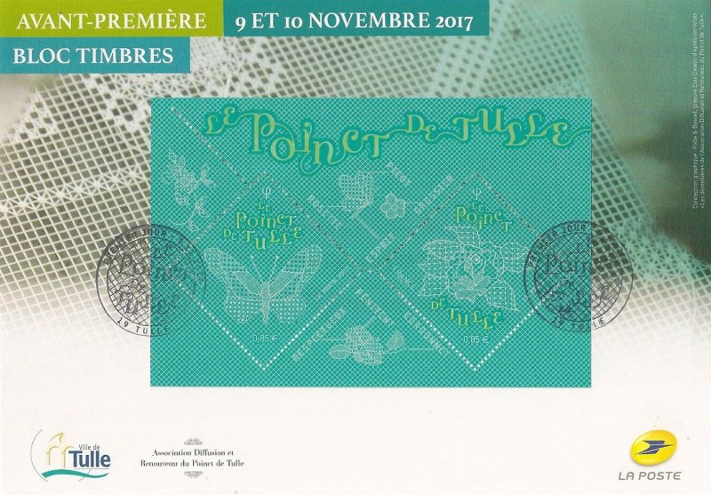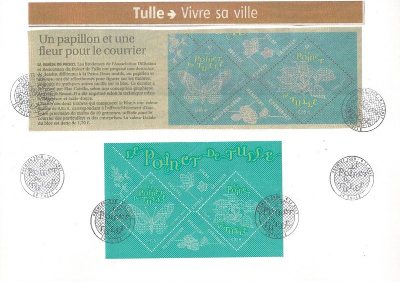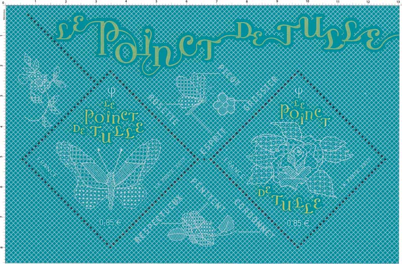| Commentaire | L´une des seules (avec celle d´Alençon) et des plus belles dentelles à l´aiguille de France. Sa légèreté n´avait pas son pareil pour garnir poignets et coiffures des gens du monde. Le fameux "poinct en l´air" obtint même, dans les années 1920, le premier prix au concours Lépine, avant de disparaître, avec la fermeture du dernier atelier, en 1933. En fond : fleurs et papillon + les 7 Poincts de Tulle : le Picot, la Rosette, l'Esprit, le Grossier, le Respectueux, le Pénitent et le Cordonnet. Les TP du bloc-feuillet "Le Poinct de Tulle" : "Papillon" et "Rose". |