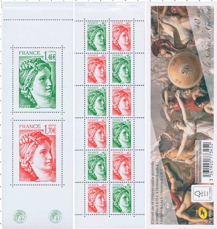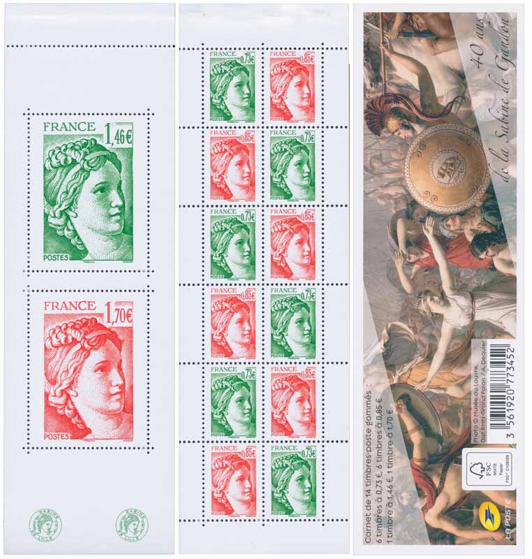 | Commentaire | Format du carnet et des 2 feuillets : 184 x 57,2 mm (2 timbres 40 x 52 mm ; 12 timbres 20 x 26 mm) L'oeuvre de Jacques-Louis DAVID : "Les Sabines arrêtant le combat entre les Romains et les Sabins" - le sujet ne représente pas "l'enlèvement des Sabines" par les Romains, thème présent chez Nicolas Poussin (1594-1665) ou Giambologna (Jehan de Boulogne, 1529-1608, sculpteur maniériste d'origine Flamande) par exemple. Il parle d'un épisode, évoqué par Plutarque (v.46 – v.125, philosophe, moraliste et penseur de la Rome antique) et Tite-Live (59 av.J.-C. – 17 ap.J.-C., annaliste et historien), qui se passe trois ans plus tard. L'oeuvre de Jacques-Louis DAVID : "Les Sabines arrêtant le combat entre les Romains et les Sabins" - le sujet ne représente pas "l'enlèvement des Sabines" par les Romains, thème présent chez Nicolas Poussin (1594-1665) ou Giambologna (Jehan de Boulogne, 1529-1608, sculpteur maniériste d'origine Flamande) par exemple. Il parle d'un épisode, évoqué par Plutarque (v.46 – v.125, philosophe, moraliste et penseur de la Rome antique) et Tite-Live (59 av.J.-C. – 17 ap.J.-C., annaliste et historien), qui se passe trois ans plus tard. |