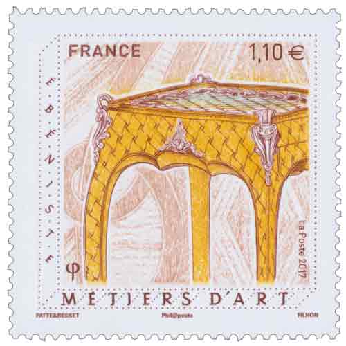 | Commentaire | Visuel : une "table en cabaret" de Roger Vandercruse (dit Lacroix), célèbre ébéniste de la noblesse parisienne, fournissant le roi Louis XVI et la cour en général. En fond : des essences et motifs de l'ébénisterie d'art. La "table en cabaret" se caractérise par un plateau à bord relevé, en bassine. Sa forme légèrement évidée avec une bordure surélevée sur tout le contour permet de recevoir sans risques les diverses boissons comme les thés, chocolats et autres breuvages. Elle est parfois munie d'une ou deux tablettes d'entrejambes. Le dessus, ou les tablettes, accueillaient parfois une jolie céramique, de la Manufacture royale de Sèvres (créé en 1756. De nos jours : "Cité de la céramique", avec le musée national de Céramique - 92-Hts-de-Seine). En savoir plus sur Wikipédia : ébénisterie |