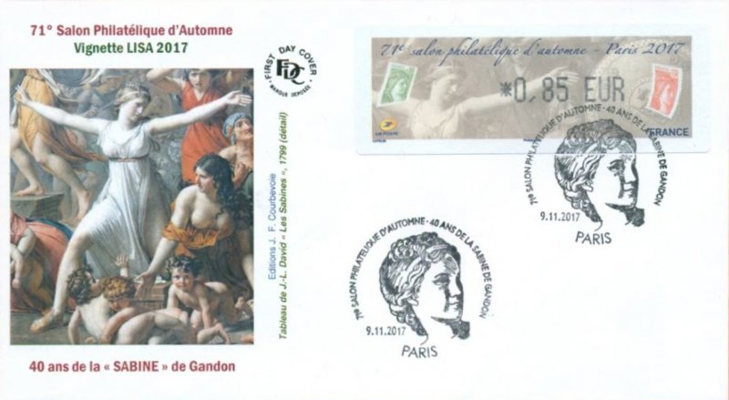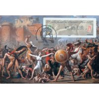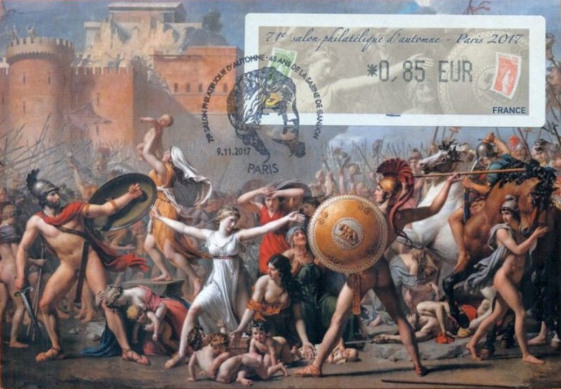 | Commentaire | Tirage : 20 000 Lisa1 et 20 000 Lisa2 L'oeuvre de Jacques-Louis DAVID : "Les Sabines arrêtant le combat entre les Romains et les Sabins" - le sujet ne représente pas "l'enlèvement des Sabines" par les Romains, thème présent chez Nicolas Poussin (1594-1665) ou Giambologna (Jehan de Boulogne, 1529-1608, sculpteur maniériste d'origine Flamande) par exemple. Il parle d'un épisode, évoqué par Plutarque (v.46 – v.125, philosophe, moraliste et penseur de la Rome antique) et Tite-Live (59 av.J.-C. – 17 ap.J.-C., annaliste et historien), qui se passe trois ans plus tard. |
