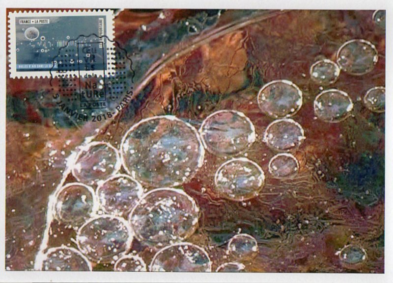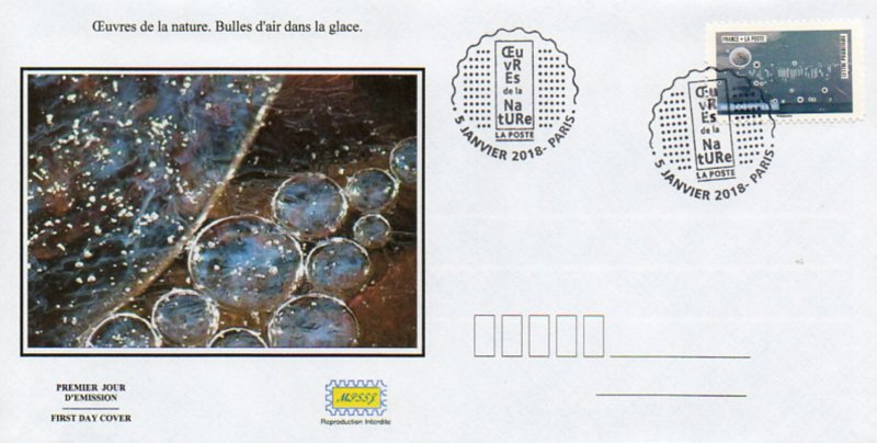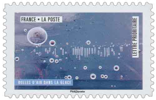 | Commentaire | Valeur faciale de chaque timbre : Lettre Prioritaire 0,95 € (nouveau tarif 2018) Un bel effet artistique, mais surtout un phénomène d'étude important. A la lumière polarisée, les bulles d'air emprisonnées dans la glace, présentent un élément d'étude intéressant afin de déterminer le rôle des gaz à effet de serre dans le système climatique global et permettent de reconstruire la composition atmosphérique sur plus de 400 000 ans. Les glaces polaires ont ainsi apporté des informations capitales sur l’évolution des teneurs passées en CO2 et CH4, les deux principaux gaz à effet de serre dont l'augmentation croissante dans l'atmosphère est liée aux activités humaines. |