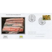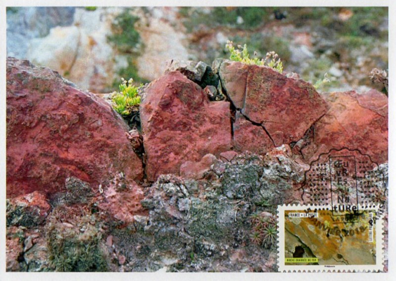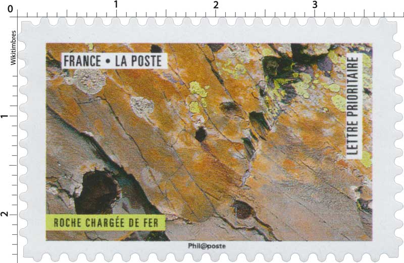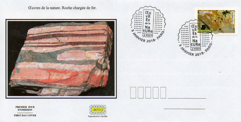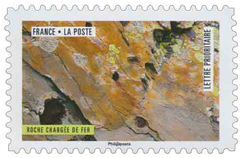 | Commentaire | Valeur faciale de chaque timbre : Lettre Prioritaire 0,95 € (nouveau tarif 2018) Une roche contenant du fer, généralement sous la forme d'oxydes, comme l'hématite (espèce minérale composée d'oxyde de fer. |