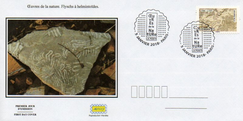 | Commentaire | Valeur faciale de chaque timbre : Lettre Prioritaire 0,95 € (nouveau tarif 2018) Le flysch est un dépôt sédimentaire détritique constitué par une alternance de grès et de marnes, qui se sont accumulés dans un bassin océanique en cours de fermeture, dans le cadre d'une orogenèse. Ce terme, fut très fréquemment employé dans les Alpes, puis s'est progressivement répandu à travers le monde. |