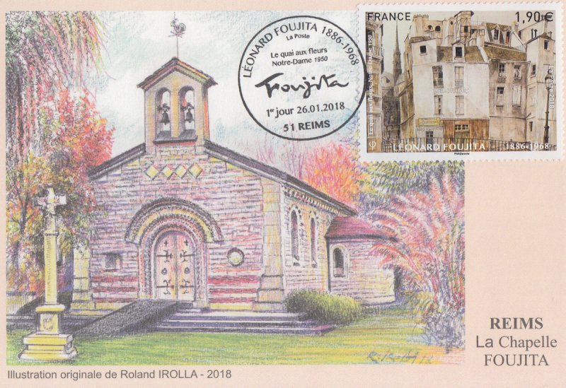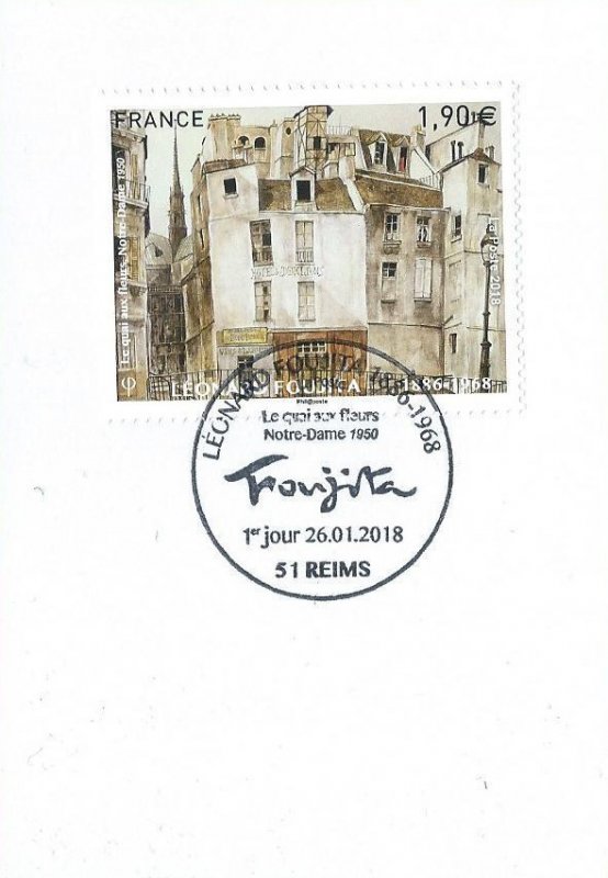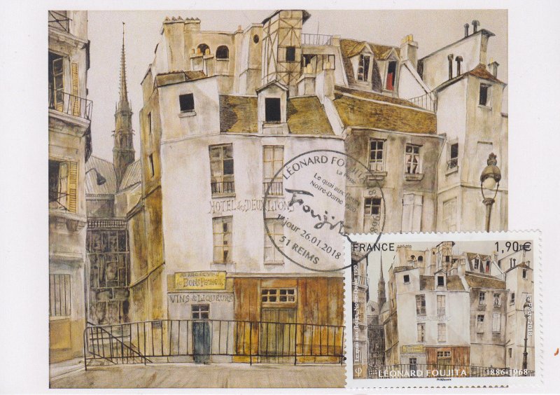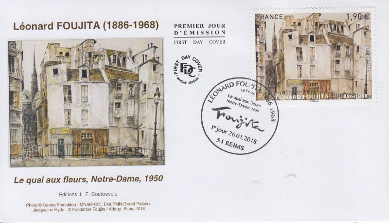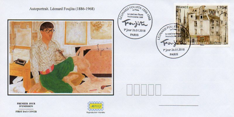 | Commentaire | Visuel : le quai aux fleurs et la flèche de Notre-Dame, dans l'île de la Cité. Tsuguharu FUJITA était l'un des enfants du général Tsuguakira FUJITA (FOUJITA, en français), médecin de l'Armée impériale japonaise. Le berceau familial est particulièrement cultivé et ouvert aux idées occidentales nouvelles. Inscrit aux cours de français dès l'école primaire, Tsuguharu étudie la peinture de style occidental aux Beaux-arts de Tokyo. Il obtient son diplôme en 1910 et n'a qu'une idée en tête, se rendre à Paris. Il débarque dans le quartier Montparnasse de la capitale, le 6 août 1913. Son premier choc artistique, sa rencontre avec Pablo Ruiz Picasso (oct.1881- avril 1973, peintre, sculpteur, céramiste, etc..). Les compositions cubistes et les peintures d'Henri Rousseau, dit Le Douanier Rousseau (mai 1844 - sept.1910, peintre) de l'atelier de Picasso le poussent à oublier ce qu'il sait, et à se jeter à fond dans la bataille des peintres avant-gardistes, décidés comme lui, à imposer leurs idées nouvelles à Paris. Il va devenir l'un des meilleurs amis des artistes montants de cette génération. Sa première exposition, en juin 1917, est un triomphe, il y expose 110 aquarelles dans un genre mi japonais, mi-gothique qu'admire Picasso. Il va réaliser plusieurs expositions et connaîtra la gloire. A la frontière de l'Orient et de l'Occident, il participera à de nombreux Salons de peinture dans plusieurs capitales européennes, aux Etats-Unis et au Japon. En savoir plus sur Wikipédia : Tsugouharu Foujita