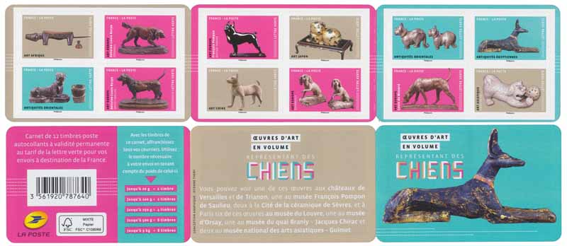 | Description | Carnet de 12 timbres-poste représentant des objets d’art, usuels, rituels, d’époque et de civilisations différentes, sur le thème des chiens. |