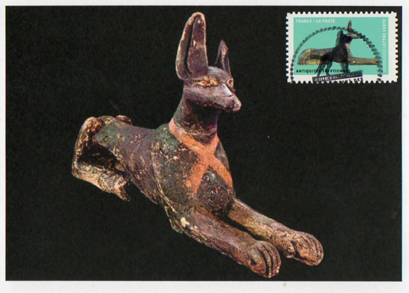 | Commentaire | Antiquités Egyptiennes © RMN-Grand-Palais (musée du Louvre) / Georges Poncet Statue d'un chien couché - Anubis (dieu à tête de chien, ou de chacal) portant parfois un ruban rouge, noué autour du cou. L'animal apparait sous deux formes : - la forme humaine, avec une tête de canidé aux longues oreilles pointues et à longue queue, tenant en général la croix ankh d'une main et un sceptre de l'autre. - la forme d'un grand chien, ou chacal noir, aux formes fines et élancées, le plus souvent couché sur un édicule qui représente sans doute le tombeau sur lequel il veille. Ces représentations d’Anubis étaient placées sur des sarcophages, des socles, des coffres, des naos (décor peint sur le sarcophage de Psamétik). Le chien tient une place importante dans la mythologie, car il est considéré comme un animal psychopompe (conducteur des âmes des morts). |