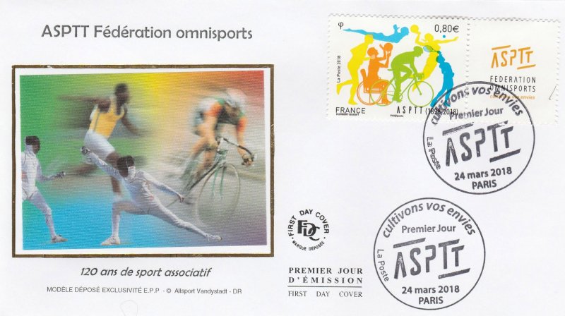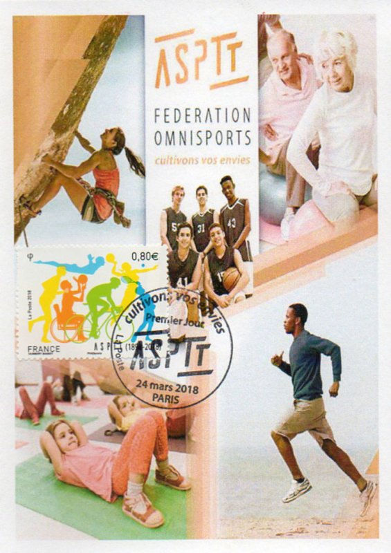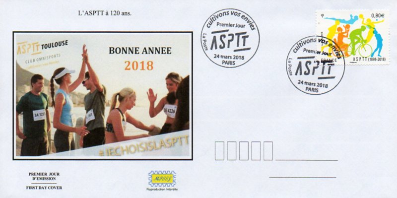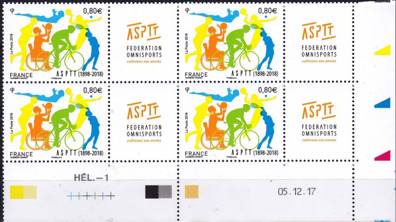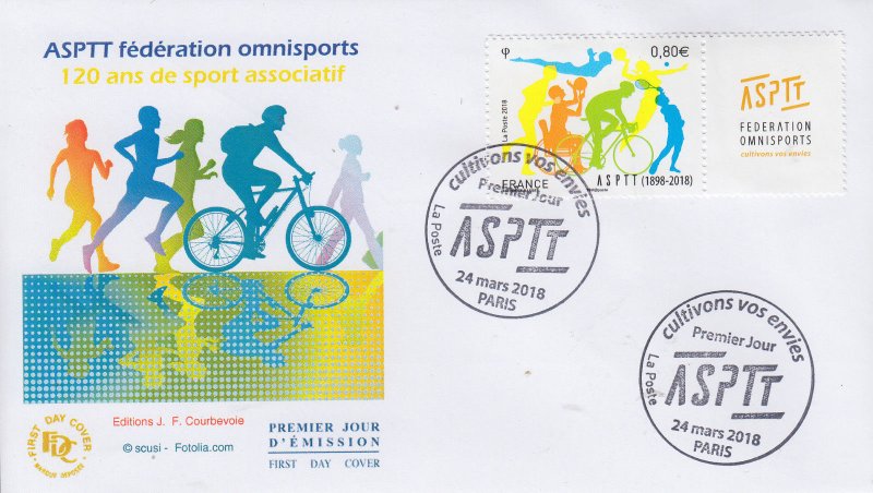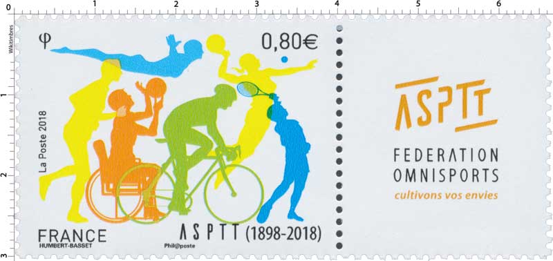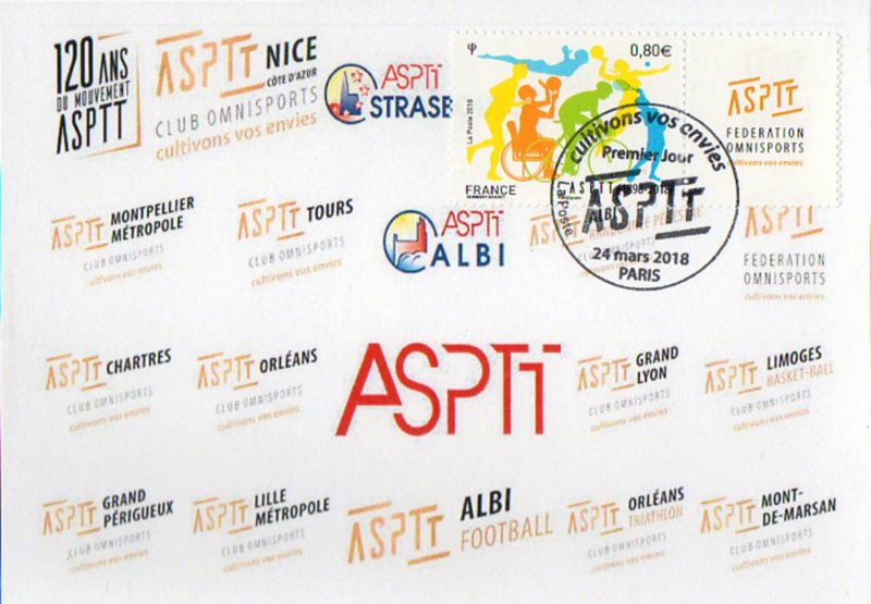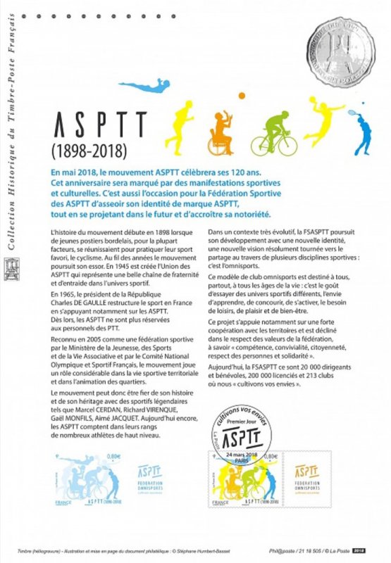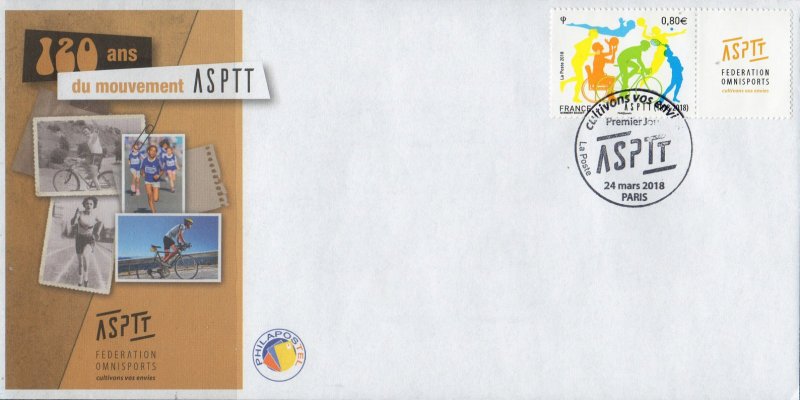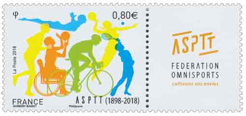 | Commentaire | Visuel : TP : course à pied et randonnée pédestre, handisport et sport adapté, natation, cyclisme et cyclotourisme, tennis, badminton + vignette : identité visuelle de la F.S.ASPTT L'association sportive des PTT, plus connue sous le sigle ASPTT, fête ses 120 ans cette année, un âge respectable et un anniversaire marquant. Phil@poste réalise un beau timbre-poste à cette occasion, dont le Premier Jour aura lieu le 24 mars 2018, au stade Charléty dans le XIIIème arrondissement de Paris de 10h00 à 13h00. Une exposition philatélique sera assurée à cette occasion par PHILAPOSTEL, Ile-de-France. Cet anniversaire sera marqué par des manifestations sportives et culturelles. C'est aussi l'occasion pour la Fédération Sportive des ASPTT d'asseoir son identité de marque ASPTT, tout en se projetant dans le futur, et d'accroître sa notoriété. L'histoire du mouvement débute en 1898, lorsque de jeunes postiers bordelais, pour la plupart facteurs, se réunissaient pour pratiquer leur sport favori, le cyclisme. Au fil des années, le mouvement poursuit son essor. En 1945 est créée l'Union des ASPTT qui représente une belle chaîne de fraternité et d'entraide dans l'univers sportif. |