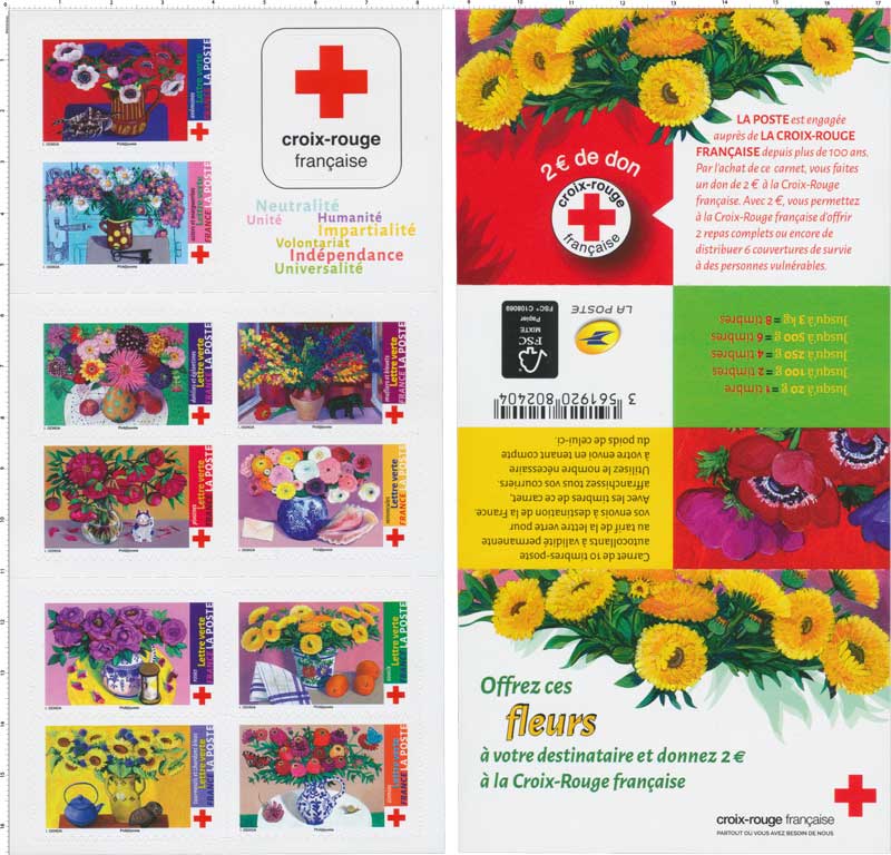 | Commentaire | Visuel : 10 beaux bouquets de fleurs à offrir, tout en faisant un don à la C.R.F. La thématique choisie porte sur la flore, plus particulièrement, sur les fleurs que l'on peut offrir, pour déclarer son amour. Ce carnet est grevé d'une surtaxe de 2,00 € de don à la Croix-Rouge Avec ces 2 €uros, la Croix-Rouge française procure 2 repas complets à des personnes vulnérables ; sécurise une mère en lui donnant tout ce qu'il lui faut pour nourrir son bébé pendant une journée et distribue 6 couvertures de survie isothermes. Avec 20 €uros, soit dix carnets, la Croix-Rouge française offre à 3 personnes un kit repas de fête, en fin d'année et donne un kit hygiène à 2 personnes hébergées temporairement dans un centre d'accueil. |