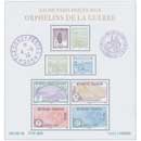 | Commentaire | Ce bloc de 8 TP, est émis dans le cadre des commémorations de la Première Guerre mondiale. Il reprend la série de timbres émise en 1917 (7 TP de 1917 et 1 TP de 1919) au profit de l'œuvre des "Orphelins de Guerre". C'est la première série commémorative française, mais également la plus prestigieuse, du XXe siècle. Ce bloc numéroté est accompagné d’un feuillet texte rédigé par Bertrand Sinais Sept figurines sur huit furent dessinées par Louis DUMOULIN et gravées par Léon RUFFÉ (le 5c + 5c vert fut dessiné par SURAND, et gravé par JARRAUD). 2c + 3c brun-lilas : la Veuve au cimetière. Revêtue d'une mantille, son image suggère l’orphelin. Aussi ce timbre fut-il peu critiqué. 5c + 5c : deux orphelins. Un garçon protège sa jeune sœur aux longues nattes et ils regardent ensemble vers un avenir incertain. Le public ayant reproché l'absence de figurines évoquant directement les orphelins, ce timbre fut émis tardivement en mars 1919 à la place d'un 5c + 5c au type Veuve. 15c + 10c gris-vert et 25c + 15c gris-bleu : femme à la charrue. Ici Dumoulin s'est inspiré, en l'adaptant, du timbre qu'il avait réalisé en 1906 pour la Tunisie. Ce thème sera repris en mai 1940 par André SPITZ et Antonin DELZERS pour un timbre 2,50f + 50c bleu au profit des œuvres de guerre. 35c + 25c ardoise et violet : tranchée et drapeau. Ici apparait une tranchée bordée de fils de fer barbelés. Le fond du paysage, imprécis à souhait, se confond avec le ciel et c'est une impression de désespoir et de désolation qui se dégage d'abord de cette composition. Mais le drapeau tricolore est là pour incarner l'esprit de résistance et la foi dans la victoire certes encore lointaine. 50c + 50c brun et brun clair : le Lion de Belfort. Très classique, ce timbre reproduit la statue située dans le 14e arrondissement de Paris, incarnation de la résistance héroïque du colonel Denfert-Rochereau en 1870, qui permit de garder la ville de Belfort à la France. 1f + 1f carmin et 5f + 5f noir et bleu : la Marseillaise. Les deux plus fortes valeurs de la série représentent un détail du haut-relief de Rude, qui orne l'arc de triomphe de l'Étoile. La série se termine sur l'idée de la victoire pour laquelle les orphelins ont payé un si lourd tribut. La série des Orphelins, à la fois 1ère série commémorative et 1ère série à surtaxe de France, si décriée lors de sa sortie, est devenue avec le temps la vedette du XXe siècle, celle que tout collectionneur rêve de posséder. |