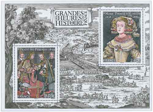 | Commentaire | Le bloc-feuillet des Grandes Heures de l'Histoire de France 2018 nous parle : du "Traité des Pyrénées", conclu le 7 nov.1659 entre le roi de France, Louis XIV (règne 1643-1715) et le roi d'Espagne, Philippe IV (règne 1621-1665), mettant ainsi fin à la guerre franco-espagnole débutée en 1635, depuis la participation du royaume de France à la Guerre de Trente Ans (1618 à 1648), et de Marie-Thèrèse d'Autriche (1638-1683), infante d'Espagne et du Portugal, Archiduchesse d'Autriche et futur reine de France et de Navarre, par son mariage avec Louis XIV (le 9 juin 1660, à St-Jean-de-Luz - 64) |