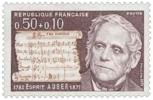 Le timbre-poste français émis en 1971 en hommage à Daniel-François-Esprit Auber s’inscrit dans la tradition des figurines commémoratives associant célébration culturelle et contribution sociale, puisqu’il est assorti d’une surtaxe au profit de la Croix-Rouge française. Mis en vente générale le 8 mars 1971 après une vente anticipée le 6 mars à Caen, ville natale du compositeur, ce timbre appartient à la production philatélique française du début des années 1970 qui accorde une place régulière aux grandes figures de la musique et des arts. Il correspond au tarif de la lettre simple jusqu’à 20 grammes pour la France métropolitaine, ce qui lui assure une diffusion significative dans l’usage postal courant, tout en conservant une dimension commémorative marquée. Dessiné et gravé en taille-douce par Jean Pheulpin, le timbre adopte un format horizontal et une composition sobre, centrée sur le portrait d’Auber et la reproduction d’une partition de son opéra Fra Diavolo, œuvre emblématique créée en 1830 et longtemps populaire sur les scènes françaises. Cette iconographie rappelle la place d’Auber dans l’histoire de l’opéra-comique et de l’opéra romantique français, aux côtés de compositeurs tels que Boïeldieu, Meyerbeer ou Adam, et souligne son talent pour une écriture mélodique élégante et expressive, souvent qualifiée de légère mais fondée sur une solide tradition musicale. L’émission intervient à l’occasion du centenaire de la disparition du compositeur, mort à Paris en 1871, et contribue à réévaluer une œuvre parfois éclipsée par les évolutions esthétiques du XIXᵉ siècle et par les débats opposant les partisans de l’opéra français aux admirateurs de Wagner. Par son tirage relativement important et sa période de commercialisation limitée à quelques mois, ce timbre constitue à la fois un outil postal fonctionnel et un document philatélique représentatif de la politique culturelle et commémorative de la France en 1971, associant mémoire artistique et solidarité nationale. |