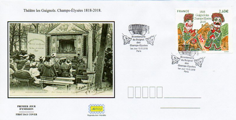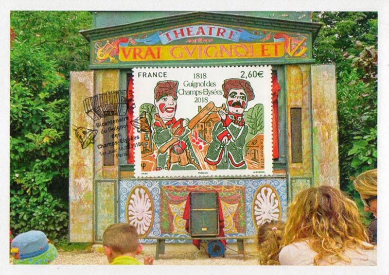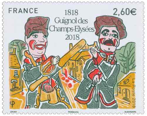 | Description | Provenant du bloc de deux timbres de 2.30 € pour la naissance du théâtre de Guignol des Champs-Élysées en 1818 |