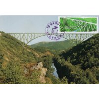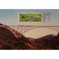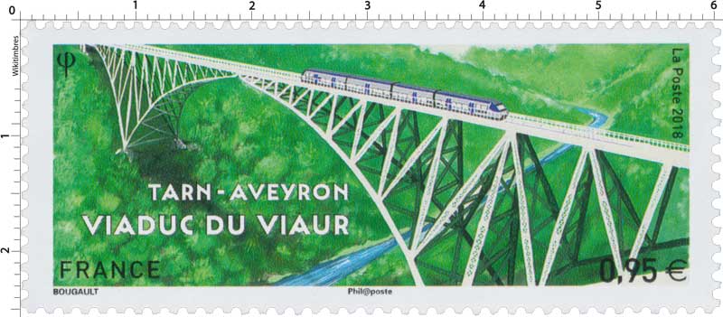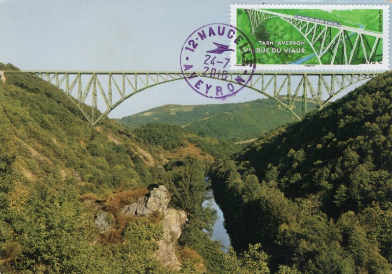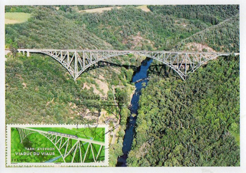 | Commentaire | Le viaduc du Viaur est un ouvrage ferroviaire commencé en 1896 et achevé en 1902, qui franchit la profonde vallée du Viaur entre Rodez (12-Aveyron) et Albi (81-Tarn). Ce pont, situé sur les communes de Tauriac-de-Naucelle (Aveyron) et Tanus (Tarn), avait pour objectif de permettre à la voie ferrée Carmaux-Rodez de désenclaver le Ségala (région géologique se situant dans les parties Ouest et Nord-Ouest du département de l'Aveyron et dans le Nord-Est du département du Tarn). En 1887, la construction du viaduc du Viaur fait l'objet d'un concours : cinq entreprises, parmi lesquelles celle de Gustave Eiffel (viaduc de Garabit en 1884), présentent sept projets. C'est celui de la Société de construction des Batignolles et de son ingénieur Paul Bodin (portrait sur le Timbre à Date) qui est retenu. En savoir plus sur Wikipédia : Viaduc du Viaur |