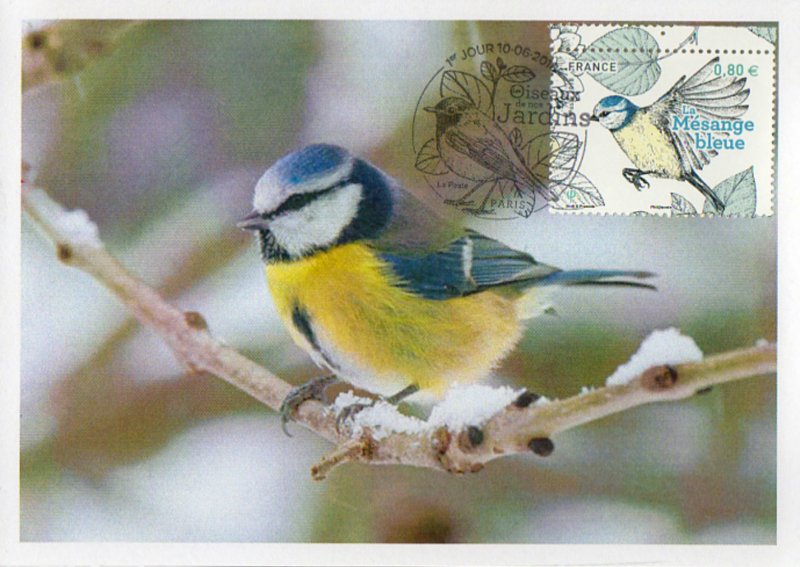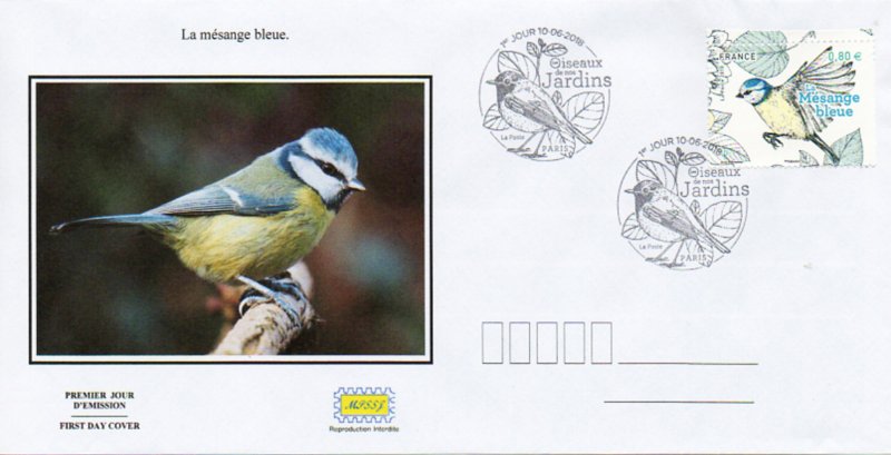 | Commentaire | La mésange bleue (Cyanistes caeruleus) : c'est une espèce de passereaux de la famille des paridés (8 genres et 59 espèces, portant le nom de mésange). - La mésange bleue adulte a une taille moyenne de 10 à 12 cm pour un poids moyen de 11 g (de 9 à 14 g). Elle se caractérise par la couleur bleue cobalt de sa calotte, comme celle de ses ailes et le dessus de sa queue. Ses joues et son front sont blancs (jaunâtres chez les oisillons), un bandeau noir sur les yeux rejoint sa nuque bleu noir (sauf une tache blanc bleuâtre). Elle a un menton et le haut de la gorge noirs ; son collier auriculaire noirâtre, tel une "écharpe", contourne toute la tête, de la nuque jusqu'au-dessous du bec. La poitrine et le ventre sont jaunes, ce dernier étant marqué d'une zone médiane blanche autour d'une tache bleuâtre à noire qui se prolonge parfois en une très fine raie longitudinale. Son dos et son croupion sont d’une douce couleur vert-jaune amande, sa queue échancrée avec la rectrice externe seule liserée de blanc. Le bec de 8–9 mm de longueur est noir et a une pointe brunâtre, les pattes ont une couleur bleu ardoisé foncé et sont munies de griffes grises. L'iris de l'œil est brun foncé. C'est une visiteuse habituelle des mangeoires en hiver. La mésange zinzinule. En savoir plus sur Wikipédia : La mésange bleue Le timbre émis en feuille possède une bande fluorescente à droite et le papier ne réagit pas aux UV |