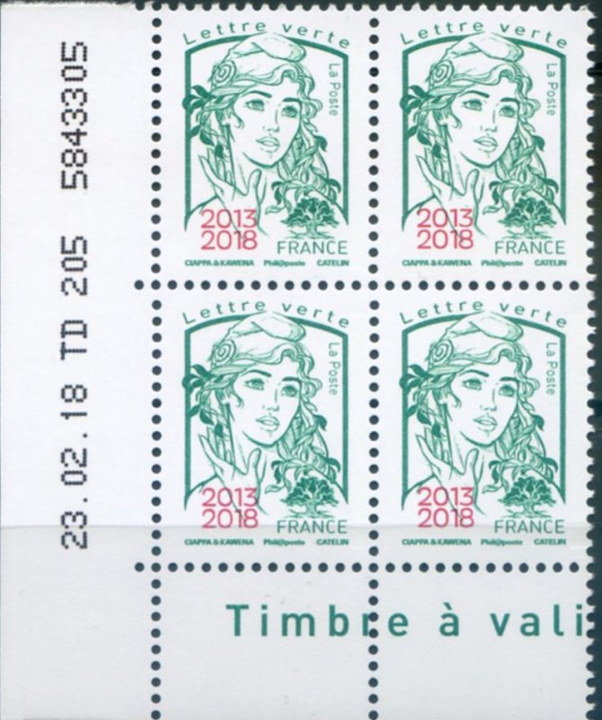 | Description | Provenant des feuilles "Marianne et la Jeunesse" surchargées 2013 - 2018, soit les première et dernière années d'émission |