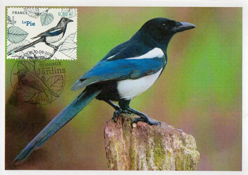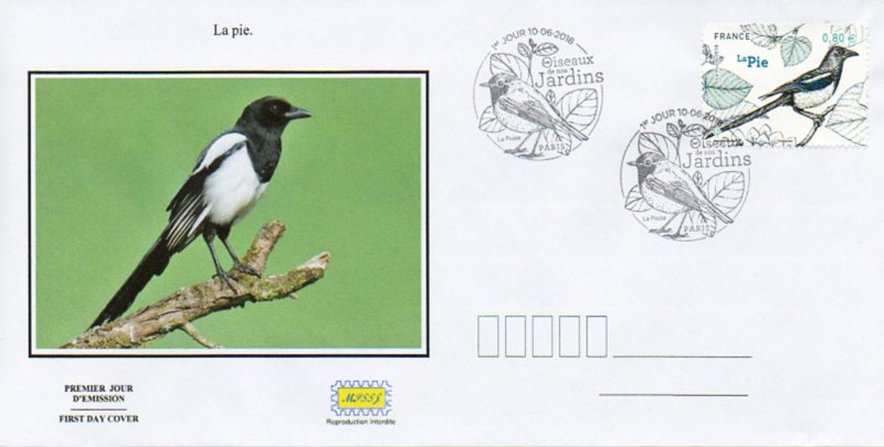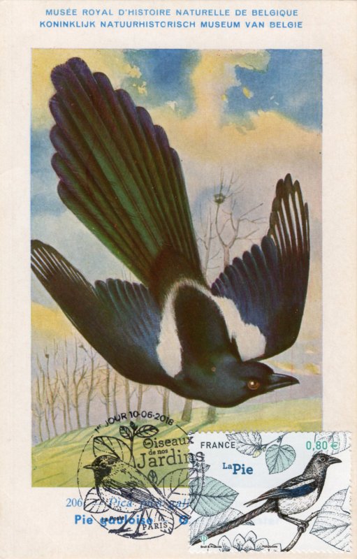 | Commentaire | La Pie, désigne en français, certains grands oiseaux au plumage noir et blanc. La Pie bavarde (Pica pica) : c'est l'une des grandes espèces de corvidés parmi les plus répandues en Europe et dans une grande partie de l'Asie. Les pies peuvent aisément être identifiées grâce à leur morphologie et à leur plumage noir et blanc caractéristique. Il existe 13 sous-espèces de pie bavarde. La pie bavarde arbore un plumage noir sur le dessus du corps, au niveau de la tête, de la poitrine et de la partie sous-caudale, et blanc au niveau du ventre, des flancs, des rémiges primaires et à la base des ailes. Le plumage noir montre des reflets métalliques, bleuâtres sur les ailes, violacés sur le corps et la tête, et verdâtres sur la queue, dus à une iridescence des plumes. Le bec est noir, de même que les pattes et l'iris des yeux. Cet oiseau d'assez grande taille (long.: 44 à 56 cm) est doté d'une longue queue (20 à 30 cm). L'envergure varie de 52 à 60 cm et le poids de 190 à 250 g. Chez les pies, le mâle est légèrement plus grand que la femelle, mais il n'existe pas de réel dimorphisme sexuel chez cette espèce. Leur durée de vie est de 15 ans, ce qui est un score moyen, mais leur longévité maximale connue est de plus de 21 ans. C'est une espèce bruyante et peu farouche qui aime à vivre dans le voisinage de l'Homme et semble apprécier, et de plus en plus, nicher près des habitations et dans les espaces verts où elle atteint ses plus fortes densités. La pie jacasse, et ses vocalisations sont variées, mais toujours un peu nasales et rauques, et parfois un peu gémissantes. C'est l'un des oiseaux les plus intelligents : l'individu de l'espèce, à l'instar du corbeau, possède une capacité d'apprentissage qui en fait un oiseau capable de s'adapter à de nombreux changements de l'environnement. En savoir plus sur Wikipédia : La Pie |