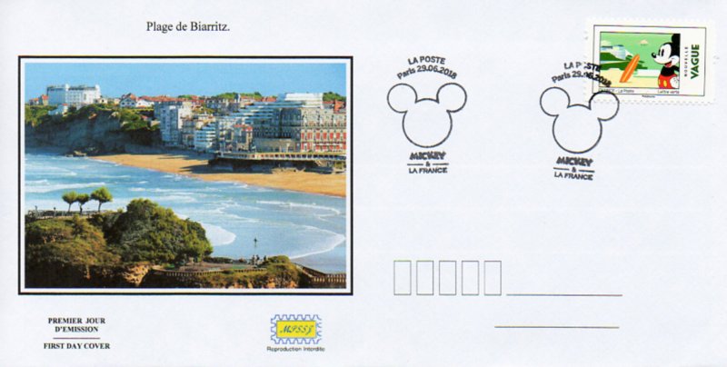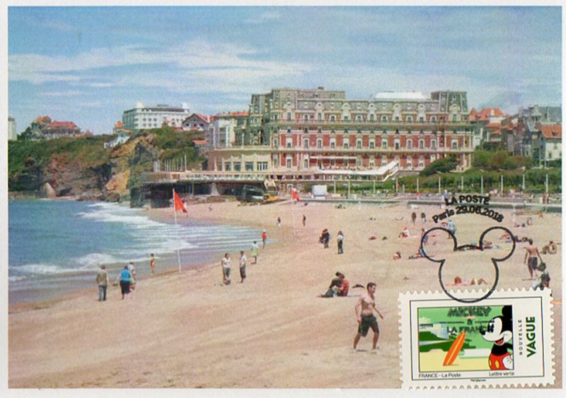 | Commentaire | Nouvelle vague - Biarritz, au Pays Basque - 64-Pyrénées-Atlantiques. Côte d'Aquitaine, golfe de Gascogne - la station balnéaire avec ses plages et spots de surf. La grande plage entre l’Hôtel du Palais (ancienne Villa Eugénie) et le Centre de Congrès "Le Bellevue" (fond du TVP). Une planche de surf, dans le sable. En savoir plus sur Wikipédia : Mickey