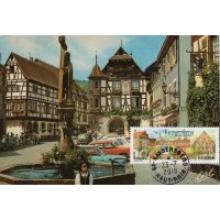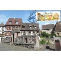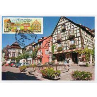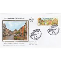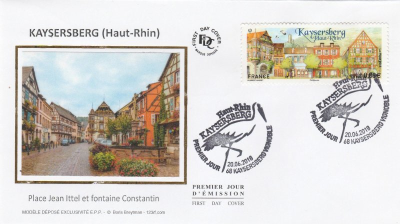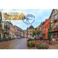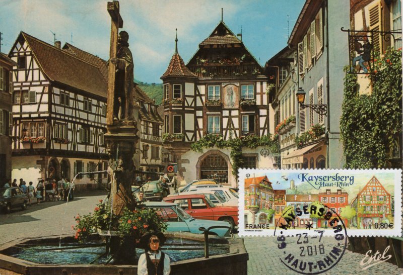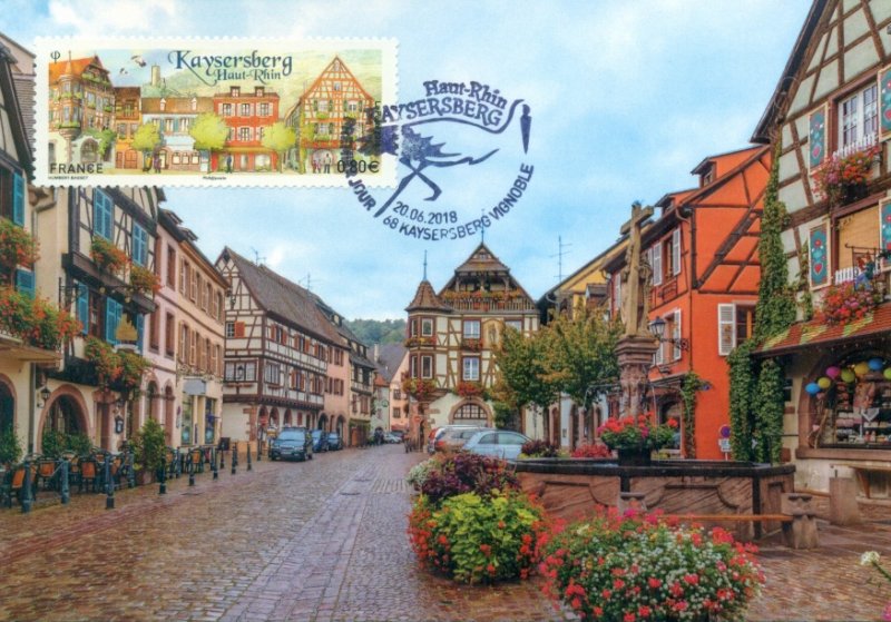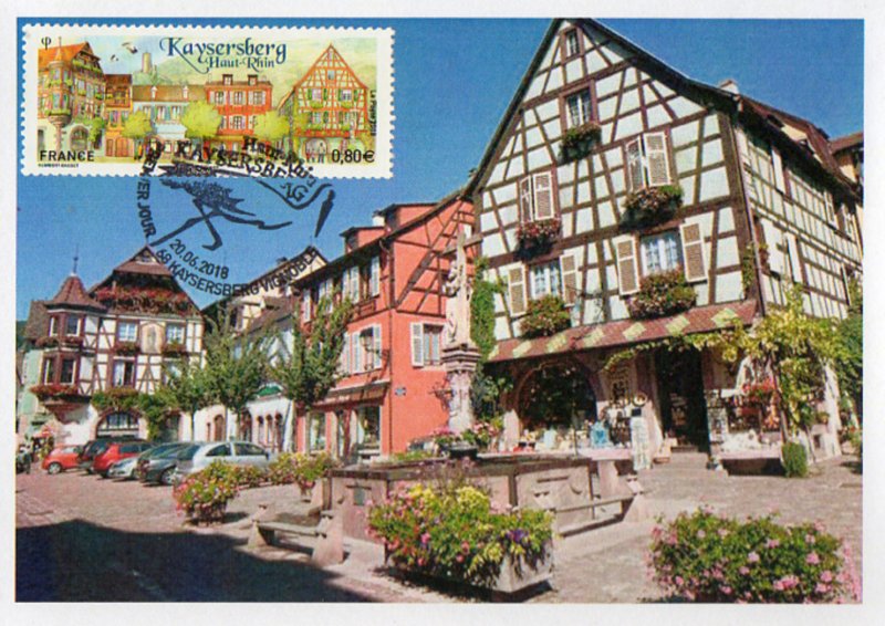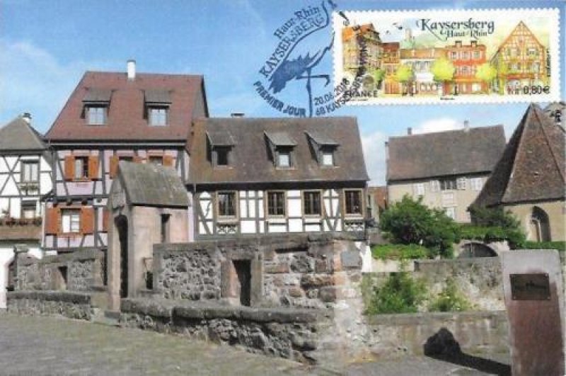 | Commentaire | Visuel : au pied des ruines du château, entre la "Maison de la Vierge" et l'église Sainte-Croix ; la rue du Général de Gaulle, la place Jean Ittel (ancienne place de l'église) et la fontaine de l'Empereur Constantin brandissant la Croix Kaysersberg, dans la région Grand Est, a été élu "Village préféré des Français, 2017", lors de l’émission de France 2 présentée par Stéphane Bern. Le site de Kaysersberg fut occupé dès le néolithique et va se développer sous l'occupation des légions romaine. En 1140, un couvent de bénédictins s'implante dans la ville. De 1218 à 1227, Frédéric de Hohenstaufen (Frédéric II : déc.1194 à déc.1250, Roi de Germanie : 1212-1250, Empereur des Romains "Imperator Romanorum" : 1220-1250) va faire bâtir un château impérial, ainsi que des remparts, autour de la cité de Kaysersberg (ou "Montagne de l'Empereur" en français). Entre 1230 et 1235 a été construite l'église Sainte-Croix et le couvent des bénédictins est repris par les clarisses de Kientzheim en 1283. En 1293 la commune de Kaysersberg devient ville libre de l'Empire et en 1354, elle rejoint la Décapole avec Haguenau, Colmar, Wissembourg, Turckheim, Obernai, Rosheim, Munster, Sélestat et Mulhouse, ils seront rejoints par Seltz vers 1358 et Landau en 1521. Les XIVe et XVe siècles sont des périodes de prospérités, la ville s'agrandit, le commerce se développe et le vin s'exporte. C'est la Guerre de Trente ans (1621 à 1648, Traités de Westphalie) qui va stopper cette croissance jusqu'à la fin du conflit, où l'Alsace est complètement dévastée. Au XVIIe siècle, la ville impériale de Kaysersberg va connaitre une nouvelle naissance économique, la population augmente, la paix règne et en 1797, Joseph Barthélémy transforme les bâtiments du couvent (abandonnés à la Révolution, v.1792-94) et y implante une manufacture de toiles peintes, suivi d'une industrie du papier et de la cartonnerie. En savoir plus sur Wikipédia : Kaysersberg