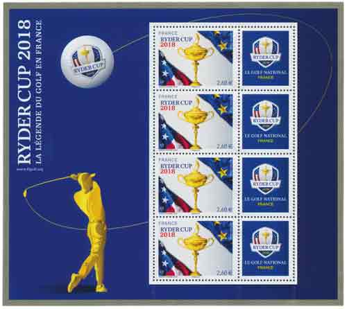 | Description | Réédition avec fond bleu, encadrement doré + vernis sélectif et valeur différente du bloc émis début juillet Ryder Cup, la plus grande compétition de golf du monde qui se déroulera du 25 au 30 septembre 2018 |