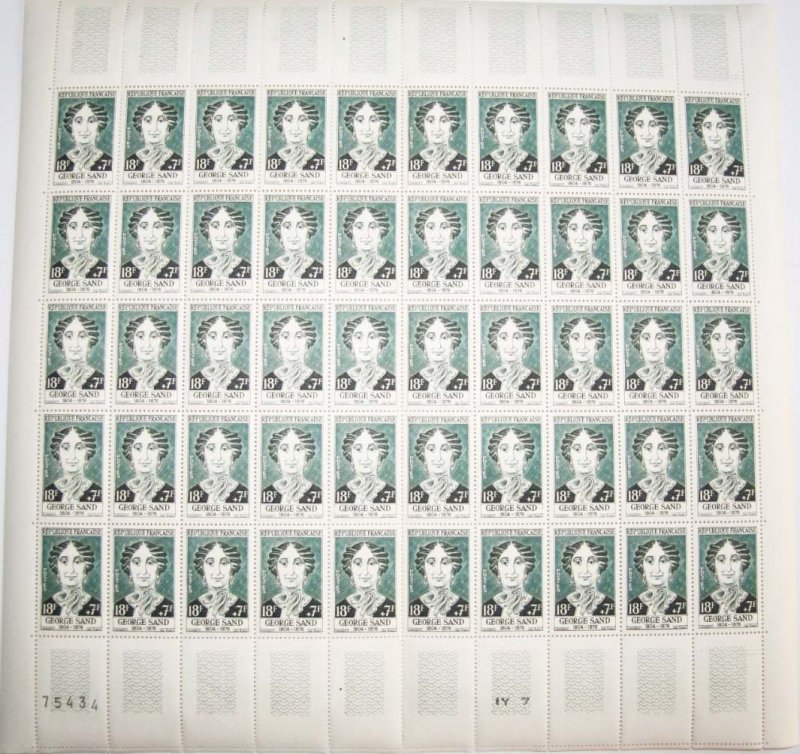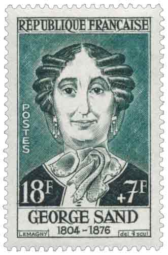| Commentaire | Timbre grevé d'une surtaxe au profit de la Croix-Rouge française Émis en 1957 par la France dans une série de six timbres-poste gravés en taille-douce consacrée à des personnages français célèbres et grevée d’une surtaxe au profit de la Croix-Rouge française, le timbre commémoratif dédié à George Sand est mis en vente à partir du 17 juin après une émission anticipée à Paris, et s’inscrit dans les émissions caritatives de l’après-guerre associant usage postal courant et hommage littéraire ; imprimé en taille-douce rotative au format vertical, il porte une valeur faciale de 18 francs assortie d’une surtaxe de 7 francs et correspond notamment à l’affranchissement des factures jusqu’à 20 grammes selon les tarifs en vigueur en 1957, tout en prenant place dans une série homogène par son format, sa dentelure et sa technique d’impression ; le sujet évoque l’œuvre et la figure d’Amantine Lucile Aurore Dupin, baronne Dudevant, romancière majeure du XIXᵉ siècle, dont l’évolution littéraire, des romans lyriques aux œuvres humanitaires puis aux récits champêtres tels La Mare au Diable, François le Champi ou La Petite Fadette, a durablement marqué la littérature française, faisant de ce timbre un témoignage philatélique de l’importance culturelle et sociale de George Sand dans l’histoire littéraire de la France. |