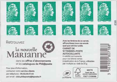 | Description | Carnet de 12 timbres-poste autoadhésifs « Marianne l’engagée » Lettre verte |