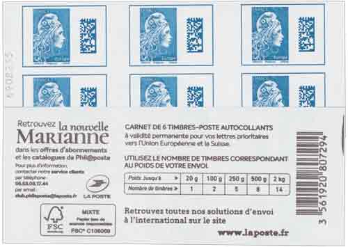 | Description | Carnet de 6 timbres-poste autoadhésifs « Marianne l’engagée » tarif EUROPE |