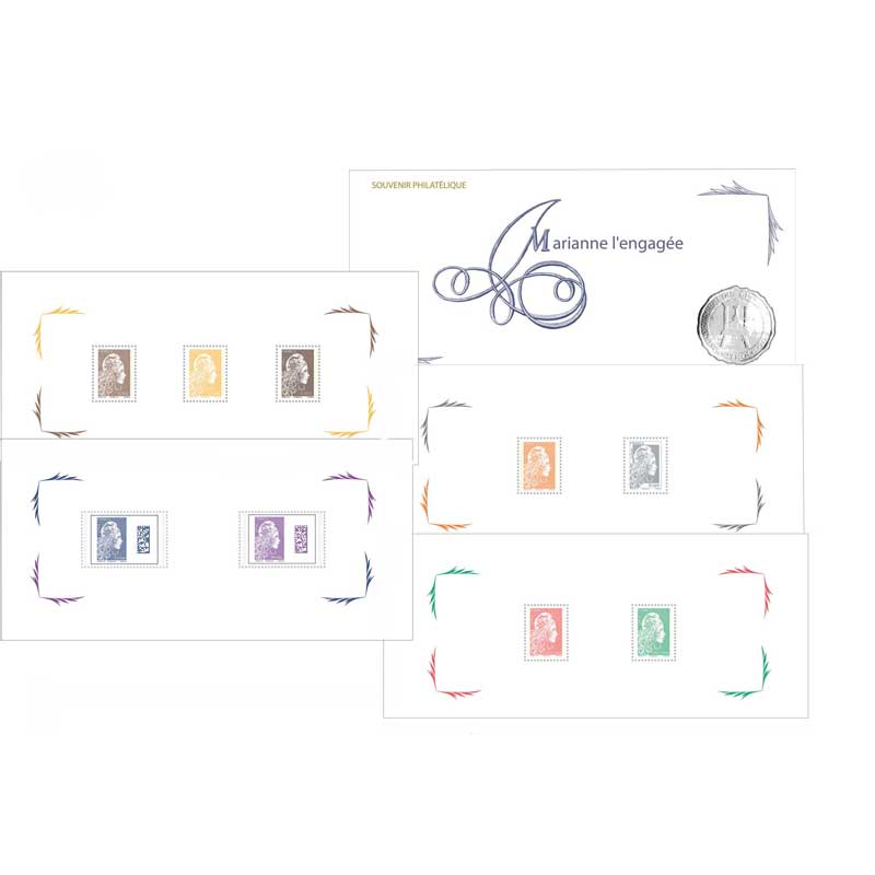 | Description | Souvenir composé d’une carte deux volets pliée et quatre feuillets gommés reprenant les différentes valeurs d’affranchissement de la nouvelle Marianne |
