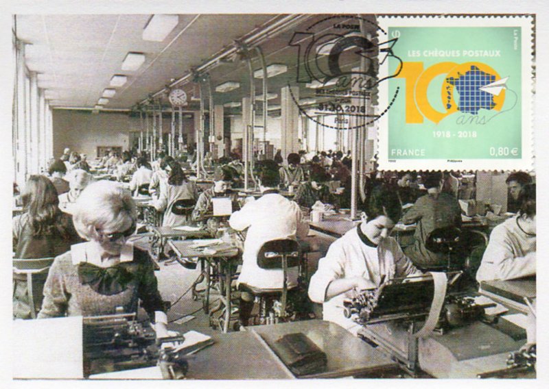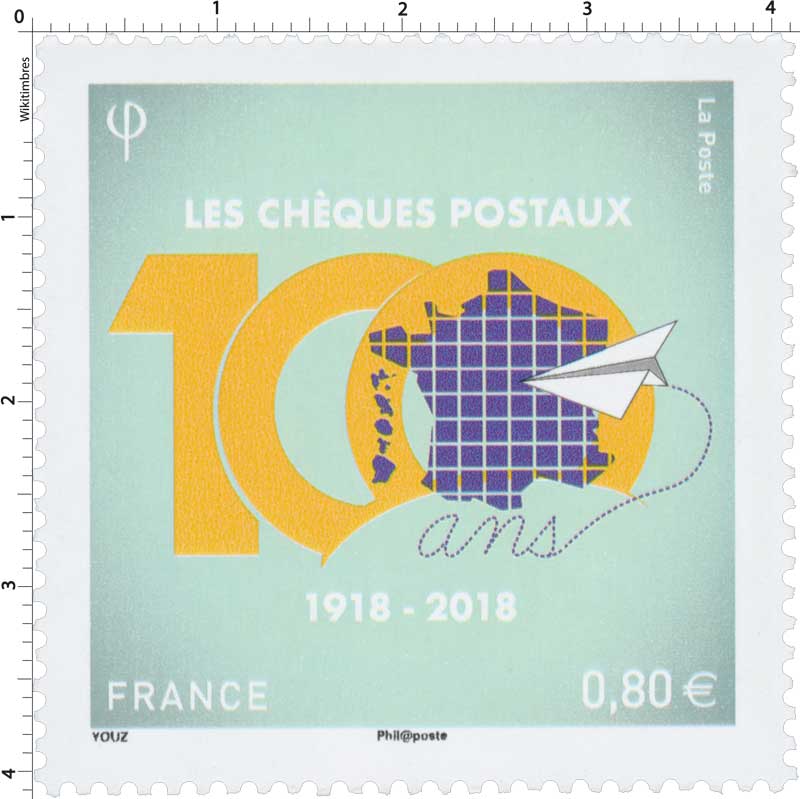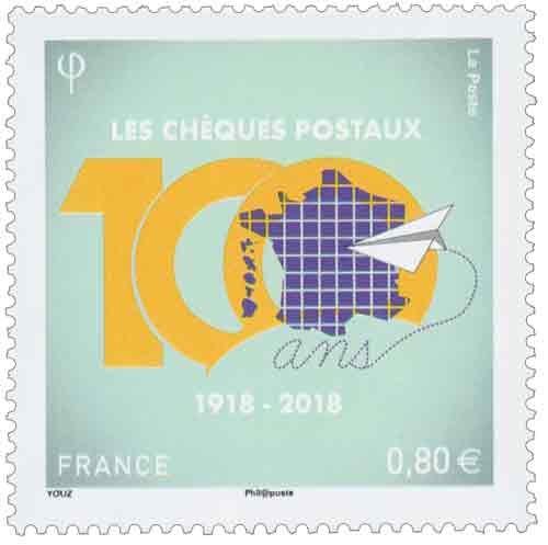| Commentaire | Visuel : centenaire des chèques postaux 1918 - 2018, avec un avion de papier, symbolisant le messager postal, survolant la carte de France métropolitaine et des territoires d'Outre-mer. Du sigle "PTT" (style "Art nouveau) de 1900 à l'oiseau bleu en forme de flèche "le messager" de 1960, et depuis fin 2005, l'oiseau bleu stylisé (de 1978) sur le "soleil", toute l’histoire d’une entreprise (actuellement du "Groupe La Poste") se donne à lire dans celle de son logo. En savoir plus sur Wikipédia : La Banque postale |