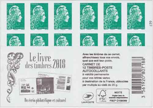 | Description | Carnet Marianne l’engagée, 12 timbres autocollants Lettre Verte |