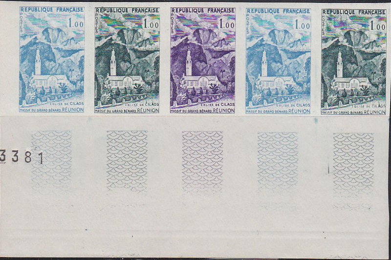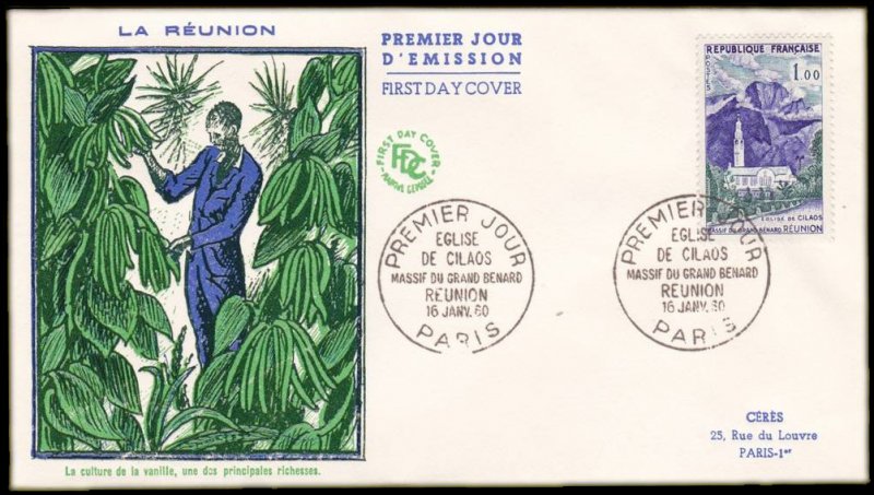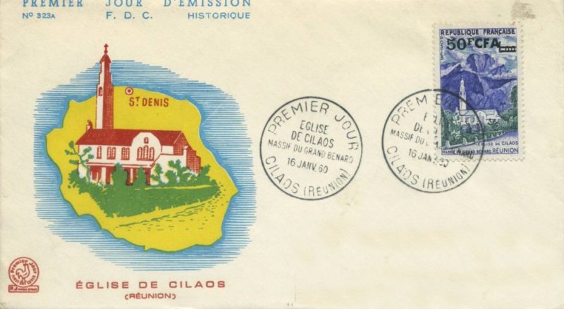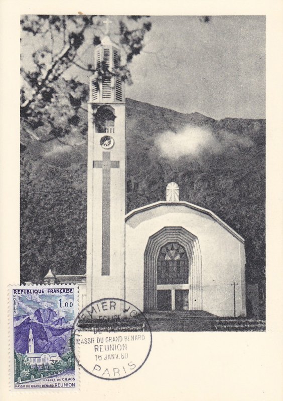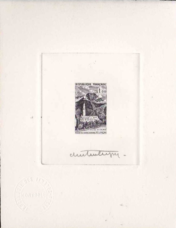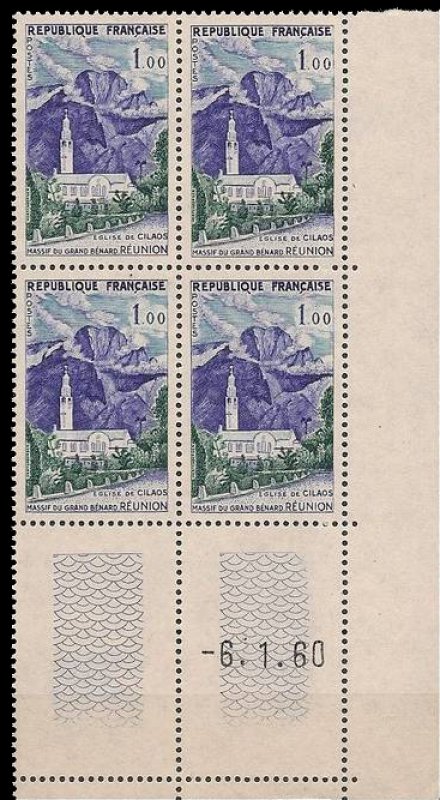 | Commentaire | Massif du Grand Bénard (Réunion) - Église de Cilaos. Usage: poste aérienne, lettres pour l'Indochine. Rattachement dép.: 97 (Grand Bénare / erreur Grand Bénard) En savoir plus sur Wikipédia : Église Notre-Dame-des-Neiges de Cilaos Non loin de la grande île de Madagascar, la Réunion en est cependant fort distincte par son origine, son histoire, ses productions. Sur une superficie réduite (2:51 km 2), des éruptions volcaniques ont amené la constitution de massifs élevés, découpés en pitons aux pentes escarpées : les principaux sont Le Piton des Neiges (3 069 m), le massif du Grand Bénard qui culmine à 2.895 mètres. Au pied des massifs créés par des effondrements mais agrandis par une érosion intense, des cirques comme celui de Cilaos : à 1.200 mètres d'altitude : la petite cité de Cilaos avec son église caractéristique, est un lieu de séjour idéal par son site et son climat. |