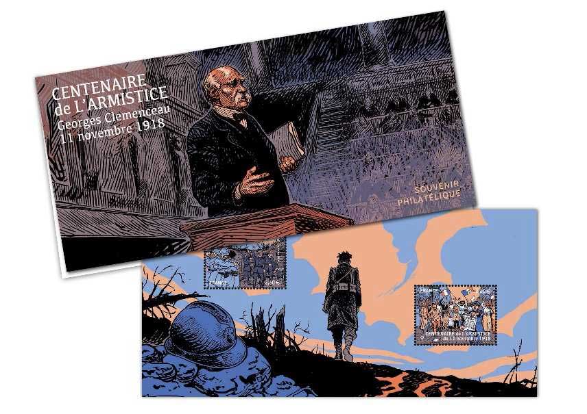 | Commentaire | Émission du salon d'automne Visuel de la couverture : la séance du Sénat, le 11 novembre 1918 : le Parlement acclame la France victorieuse et Georges CLEMENCEAU, Président du Conseil et ministre de la Guerre, son sauveur. et du feuillet : les deux timbres du bloc-feuillet sur un décor apocalyptique du champ de bataille, alors qu'un soldat exténué quitte cet enfer, après la signature de l'Armistice. En savoir plus sur Wikipédia : Armistice de 1918 |
