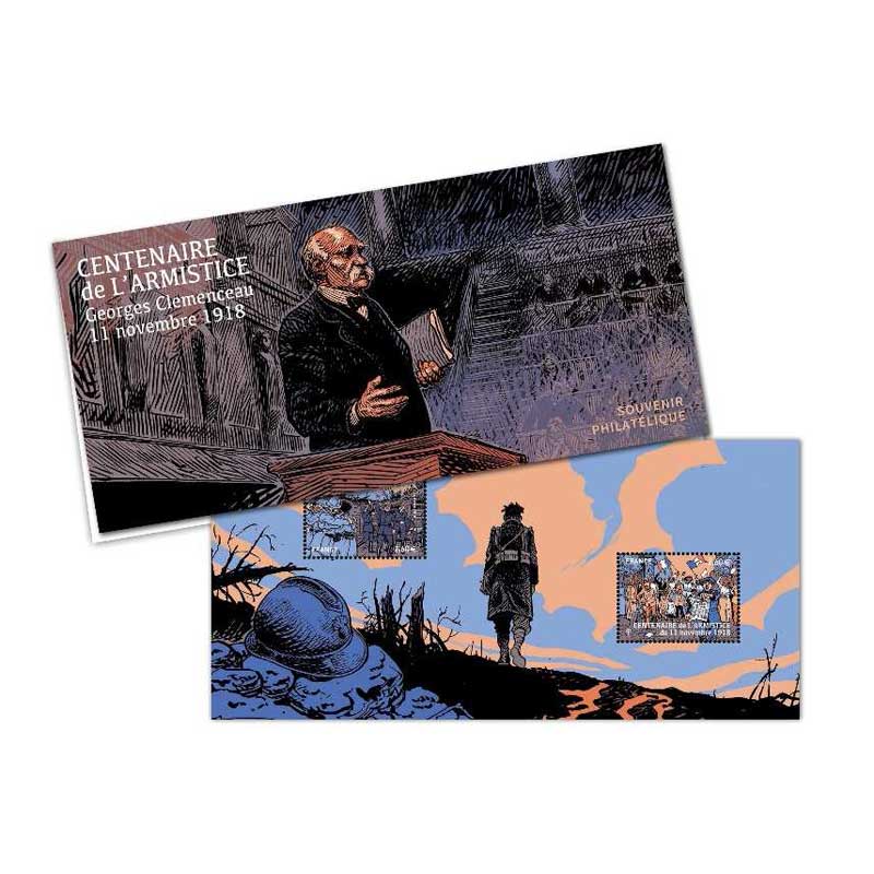 | Commentaire | Émission du salon d'automne Visuel de la couverture : la séance du Sénat, le 11 novembre 1918 : le Parlement acclame la France victorieuse et Georges CLEMENCEAU, Président du Conseil et ministre de la Guerre, son sauveur. et du feuillet : les deux timbres du bloc-feuillet sur un décor apocalyptique du champ de bataille, alors qu'un soldat exténué quitte cet enfer, après la signature de l'Armistice. En savoir plus sur Wikipédia : Armistice de 1918 |