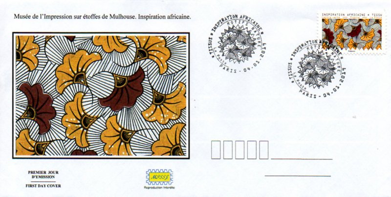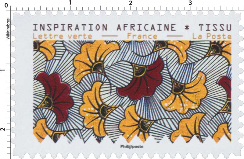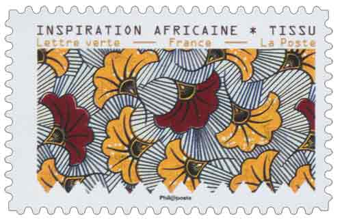 | Description | Timbre provenant du carnet de 12 timbres poste illustré par des tissus d’inspiration africaine conservés au Musée de l’Impression sur étoffes de Mulhouse |