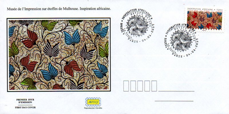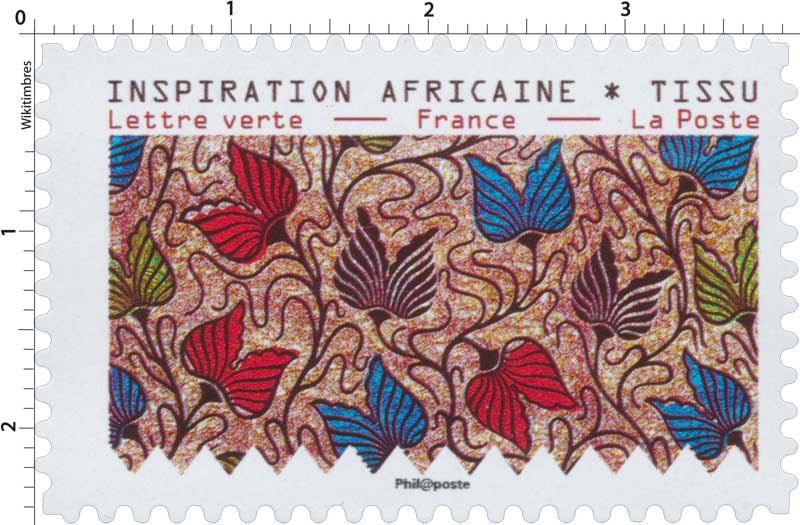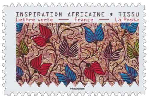 | Description | Timbre provenant du carnet de 12 timbres poste illustré par des tissus d’inspiration africaine conservés au Musée de l’Impression sur étoffes de Mulhouse |