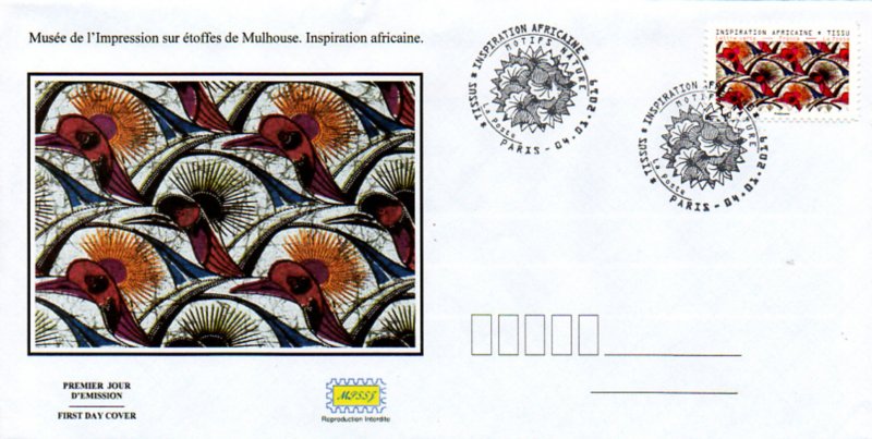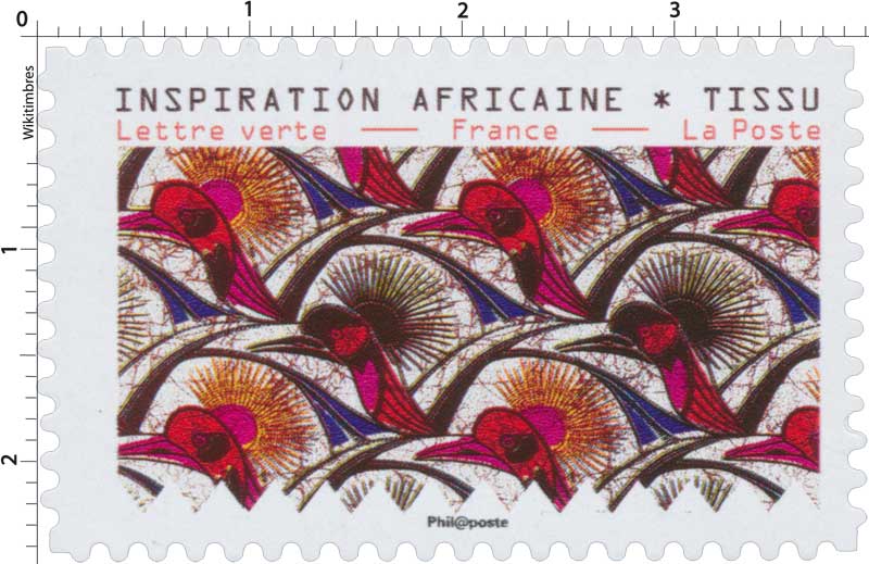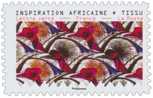 | Description | Timbre provenant du carnet de 12 timbres poste illustré par des tissus d’inspiration africaine conservés au Musée de l’Impression sur étoffes de Mulhouse |