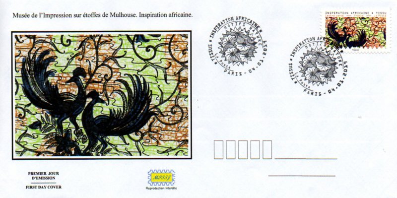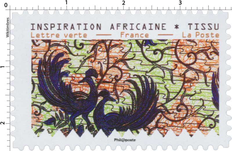 | Description | Timbre provenant du carnet de 12 timbres poste illustré par des tissus d’inspiration africaine conservés au Musée de l’Impression sur étoffes de Mulhouse |