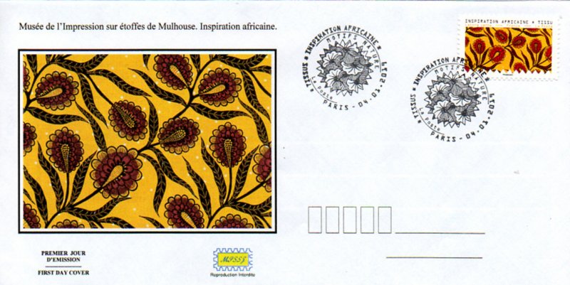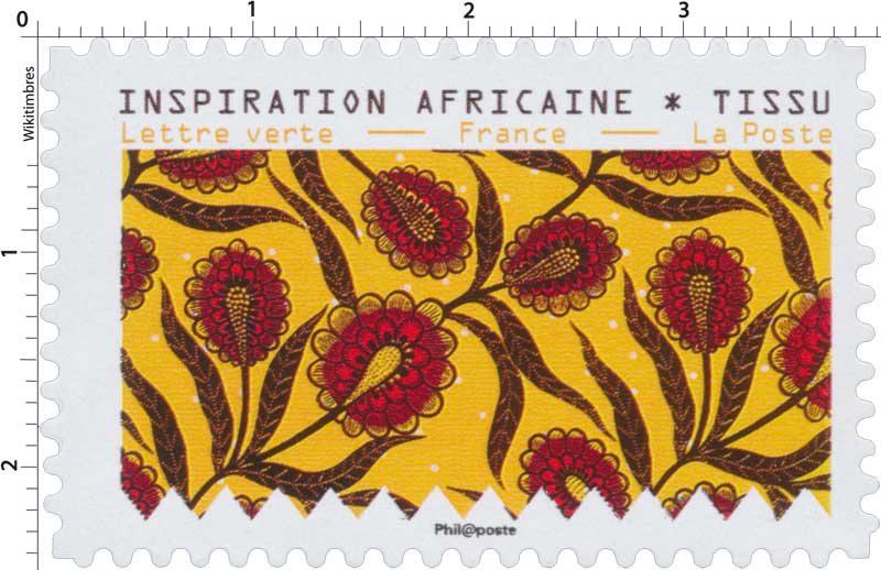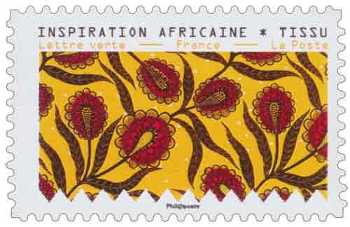 | Description | Timbre provenant du carnet de 12 timbres poste illustré par des tissus d’inspiration africaine conservés au Musée de l’Impression sur étoffes de Mulhouse |