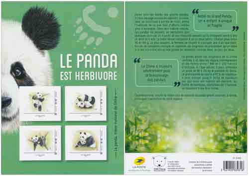 | Commentaire | Le panda géant (Ailuropoda melanoleuca), ou "grand chat-ours" ou "ours-panaché" est un mammifère, habituellement classé dans la famille des ursidés (Ursidae), endémique des régions montagneuses de la Chine centrale (régions du Sichuan, du Gansu et du Shaanxi, dans les forêts d'altitude). Le panda géant pèse de 75 à 150 kg, il mesure de 1,20 à 1,60 m. Chez la majorité des grands mammifères, les femelles sont généralement plus petites et moins massives. Le panda est noir et blanc. Constitué majoritairement de blanc, il a les oreilles, les pattes et le contour des yeux noirs. Son pelage épais le protège du froid des régions de haute altitude où il vit. Le panda possède six doigts dont un "faux pouce" opposable à ses cinq doigts. Phénomène de convergence évolutive, il provient de la transformation d'un os du poignet modifié (os sésamoïde). Cette adaptation est liée à l'alimentation et sert à attraper les tiges de bambou dont il se nourrit en grande quantité, ainsi qu'au déplacement. Herbivore, il a 42 dents puissantes, lui permettant de broyer les bambous. Son ouïe et son odorat sont très fins, ce qui favorise ses orientations et repérages. Sa vue, en revanche, est plutôt médiocre. Pour son alimentation, le panda peut inclure ponctuellement d'autres végétaux que le bambou (dont il ne digère que 17 %, après de longue heures de mastication), voire un peu de viande (par exemple des carcasses abandonnées). Son origine de carnivore explique d'ailleurs qu'il dispose d'un système digestif capable de digérer de la viande. Les pandas atteignent une maturité sexuelle vers 6 ans. Ils ne peuvent se reproduire que quelques jours par an, ce qui rend leur reproduction difficile. En savoir plus sur Wikipédia : Panda géant |
