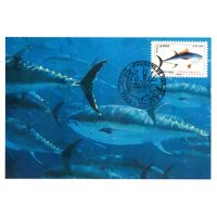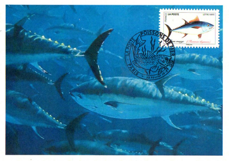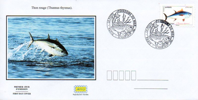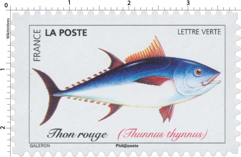 | Commentaire | Thon rouge du Nord (Thunnus thynnus) ou "scombres" : L'une des trois espèces de thon rouge avec le Thon rouge du Pacifique (Thunnus orientalis) et le thon rouge du Sud (Thunnus maccoyii). Caractéristiques : il est rapide, pouvant atteindre 20 à 30 km/h, de grande taille (2 m en moyenne - maxi 4,58 m) et pesant 684 kg au maximum - âge : de 20 à 40 ans. La reproduction : en Atlantique Ouest, ponte vers 8 ans et en Méditerranée, ponte vers 4 ans. - sa pêche : à partir de 1850, par les pêcheurs danois, puis entre 1920-30 en grande quantité, avant de diminuer régulièrement, au point de nécessiter une limitation très stricte, qui n'est malheureusement pas respectée.Grâce à son sang chaud, il est capable de nager très rapidement et de chasser dans des eaux très froides. Le thon rouge vit principalement entre deux eaux, c'est-à-dire entre la surface de l'eau et jusqu'à 500 à 1 000 m de profondeur, ce qui lui vaut d'être qualifié de "pélagique" (sous-zone épipélagique, de 0 à 200m, et mésopélagique, de 200 à 1000m). Il migre sur de longues distances. Les populations atlantiques (et autrefois de mer du Nord) remontent vers le Nord au printemps et en été, et redescendent vers le Sud à la fin de l'automne, suivant ou recherchant les bancs de maquereaux, harengs et sardines ou d'autres espèces dont ils se nourrissent. En savoir plus sur Wikipédia : Thon rouge |