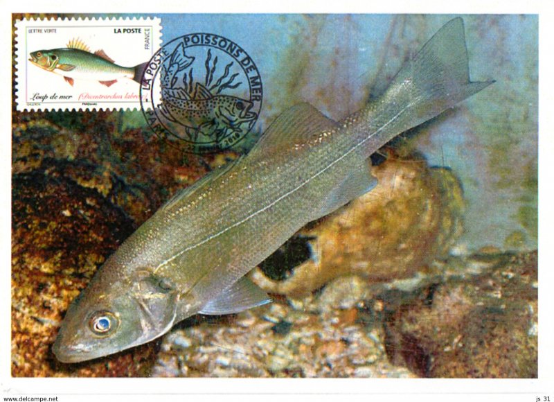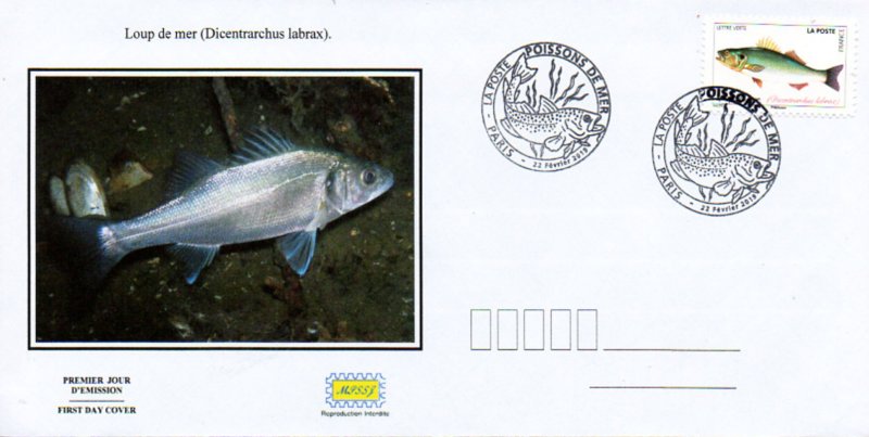 | Commentaire | Loup, ou perche de mer, le bar commun ou bar européen (Dicentrarchus labrax), est une espèce de poissons principalement marins, qui entrent parfois en eau saumâtre et en eau douce, appartenant à la famille des moronidés (poissons marins pélagiques, comprenant 6 espèces). On le trouve tout autour et à l'intérieur de l'Europe, y compris à l'Est de l'océan Atlantique (de la Norvège jusqu'au Sénégal), en mer Méditerranée et en mer Noire. Il est plus actif la nuit que le jour, et il préfère les eaux battues et oxygénées, même s'il est aussi possible de le trouver dans les ports. En termes de proies, il est très versatile : pour chasser en pleine eau des poissons grégaires de taille petite ou moyenne, des céphalopodes, des crabes nageurs ; ou dénicher des vers polychètes et des crustacés. En général il s'intéresse aux proies vivantes, c'est un véritable chasseur. Caractéristiques : il possède un corps fusiforme argenté sur les côtés et gris argenté à bleuâtre sur le dos, des petites écailles (la ligne latérale en comporte de 62 à 74), deux nageoires dorsales distinctes (la première avec 8 à 10 épines, la seconde avec une épine et 12 ou 13 rayons mous), une nageoire anale munie de 3 épines et de 10 ou 12 rayons mous, un opercule pourvu sur son bord d'une tache noire diffuse et de 2 épines plates, une nageoire caudale, modérément fourchue. Il peut atteindre 1 m de long, pour un poids de 12 kg, mais des spécimens de 50 cm, pour 1 kg sont plus courants. Le plus gros bar examiné par un spécialiste était âgé de 15-16 ans, pour un poids de 11 kg et une longueur de 92,5 cm (à Sète). Il est impossible de distinguer un mâle d'une femelle sans pratiquer l'autopsie du poisson. En savoir plus sur Wikipédia : Bar commun |