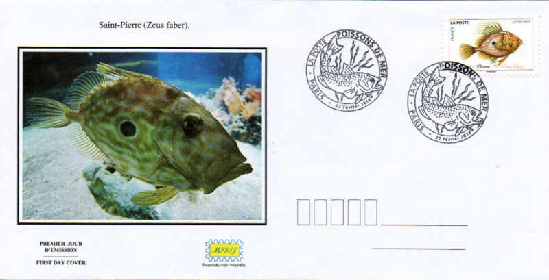 | Commentaire | Saint-Pierre (Zeus faber) : c'est une espèce de poisson de la famille des zéidés (ou Zeus, divinité suprême de la mythologie grecque). Il est aussi appelé : poule de mer, Jean-Doré (à Boulogne), zée, Soleil (à Dunkerque), Poule (à Concarneau, Lorient et en Vendée). C'est un poisson de haute mer qui vit principalement dans l'océan Atlantique (de la Norvège jusqu'aux côtes Ouest de l'Afrique), en mer Méditerranée et en mer Noire. Il vit en solitaire ou en petits groupes sur des fonds rocheux et sableux du plateau continental.Il chasse à l’affût et se nourrit de petits poissons vivant en groupes (sardines, petits harengs), de seiches et de crustacés. Poisson à la chair délicieuse, il entre dans la composition de la bouillabaisse. Caractéristiques : ce poisson est à corps haut et comprimé, d’aspect rébarbatif, ovale, dont la tête large est monstrueuse et la bouche énorme avec une mâchoire proéminente. Il est marqué d'une tache circulaire sombre sur ses flancs. Il peut mesurer jusqu'à 70 cm et peser jusqu'à 20 kg. La première nageoire dorsale est constituée de rayons épineux allongés. Des bosses épineuses, sont à la base des nageoires dorsales et anales. La reproduction : il fraye généralement de juin à août dans le golfe de Gascogne, en mers Celtique et d'Irlande, et en mer Méditerranée. La fécondation a lieu de mai à août selon le climat, et les oeufs contiennent une goutte d'huile qui les fait flotter. Après l'éclosion, les larves vivent librement. En savoir plus sur Wikipédia : saint-pierre, dorée, zée, poule de mer |