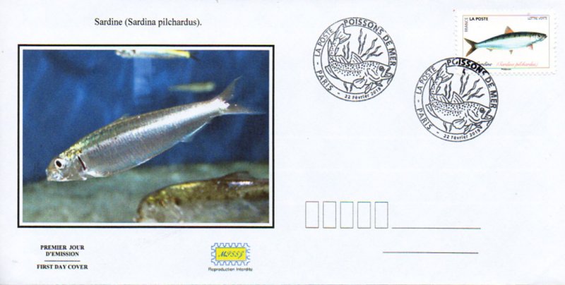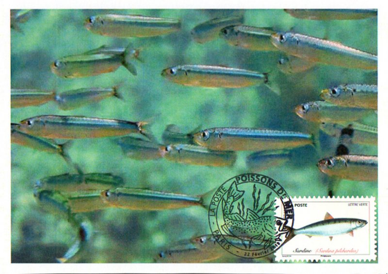 | Commentaire | Sardine (Sardina pilchardus) : poisson de la famille des clupéidés (ordre des clupéiformes, comme le hareng, l'alose et le menhaden de l'Atlantique, ou alose tyran au Québec). Selon la région, elle prend les noms de célan, célerin, pilchard, royan, sarda, sardinyola, et c'est la seule espèce de son genre.Son nom provient de la Sardaigne, car les Grecs avaient remarqué qu'elle abondait dans ses eaux côtières. La sardine évolue au large, au sein de bancs parfois très compacts, entre 10 et 50 m sous la surface. La sardine, petit poisson pélagique, est présente en mer Méditerranée, dans l'océan Atlantique Nord (de l'Irlande, jusqu'aux Açores), en zone tropicale (devant le Sénégal et la Mauritanie) et entre les côtes Atlantique Marocaine et Européenne en zone pélagique côtière de 15 m à 35 m de profondeur. Caractéristiques : mesurant au plus, une vingtaine de centimètres de long, la sardine possède un ventre argenté et un dos bleuté. Elle se caractérise par : un opercule strié, des taches sombres sur le dos, une carène ventrale peu aigüe, des écailles sessiles et les deux derniers rayons de l’arête anale, plus longs. La reproduction : elle a lieu en haute mer et peut advenir toute l'année, avec une période maximale en fin d'automne et début d'hiver au large de l'Afrique. Après une phase planctonique, les alevins rejoignent les côtes au printemps, et y restent jusqu'au début de l'hiver. En savoir plus sur Wikipédia : Sardine |
