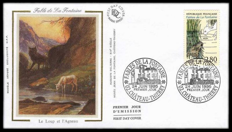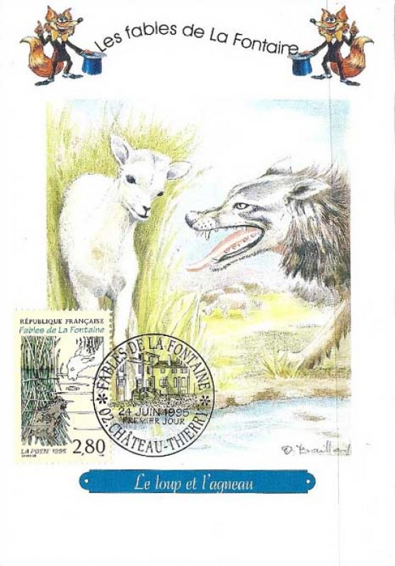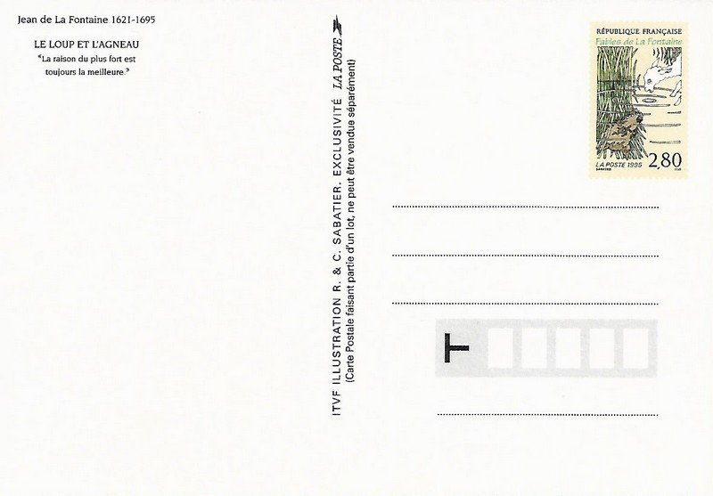 | Description | Le loup et l'agneau. Tricentenaire de la mort de Jean de la Fontaine (1621-1695), poète, fabuliste et romancier, né à Château-Thierry (Aisne) |