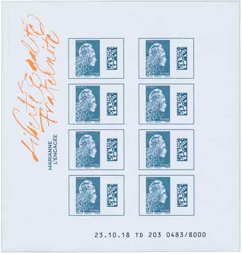 | Description | Marianne lettre Europe 20 grs datamatrix TVP provenant du coffret de 10 feuillets non dentelé |