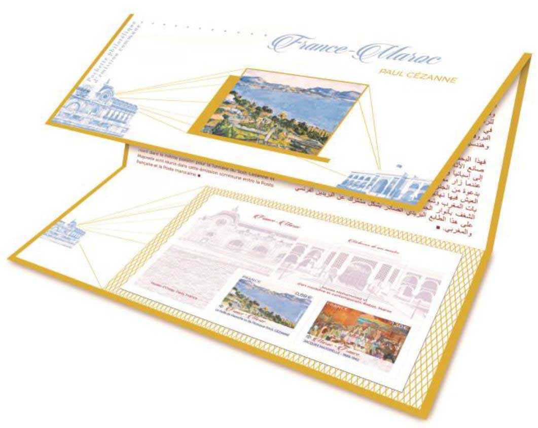 | Description | Pochette émission commune France-Maroc - Paul Cézanne « Le Golfe de Marseille vu de l’Estaque » pour un timbre et pour l’autre une oeuvre de Jacques Majorelle 1886-1962. |