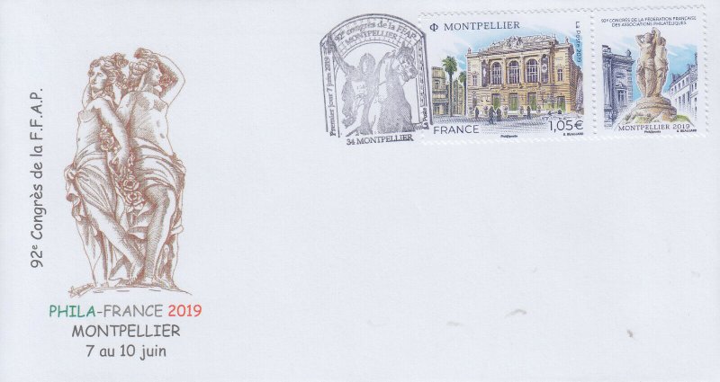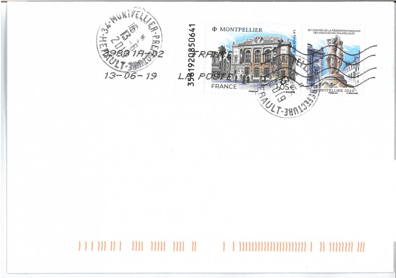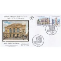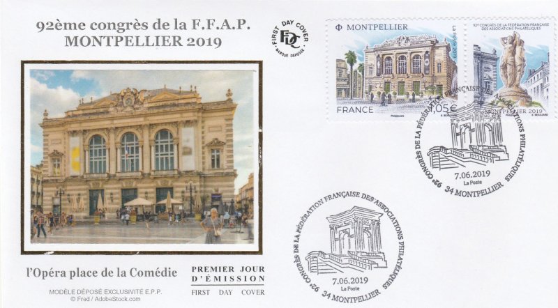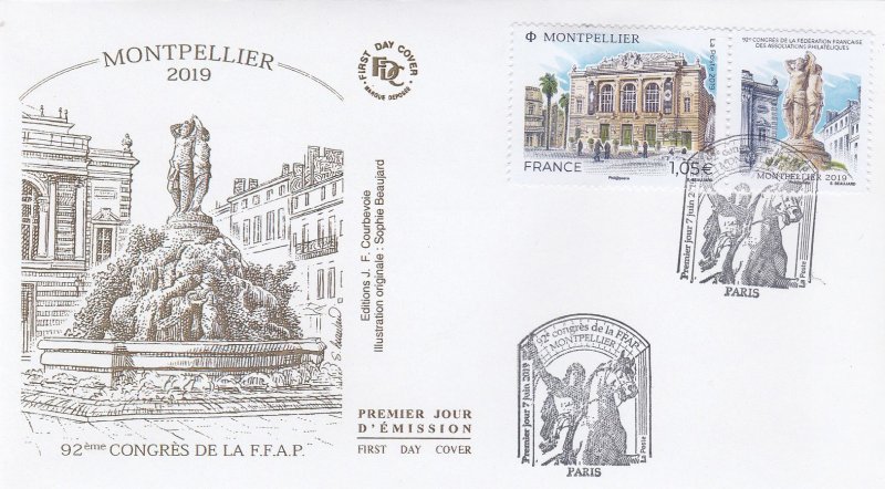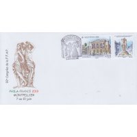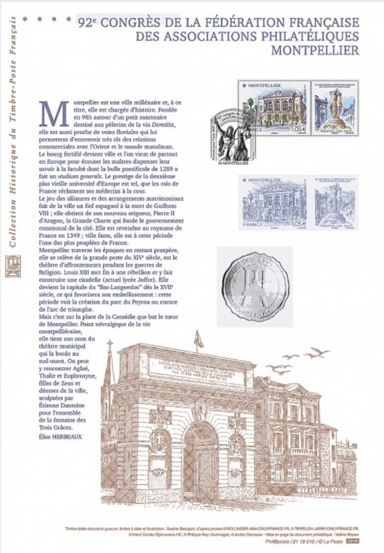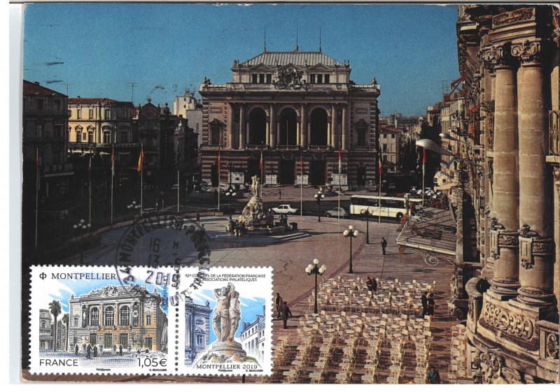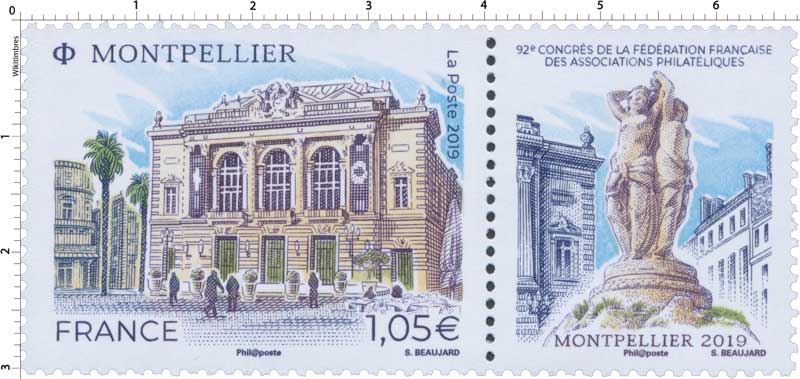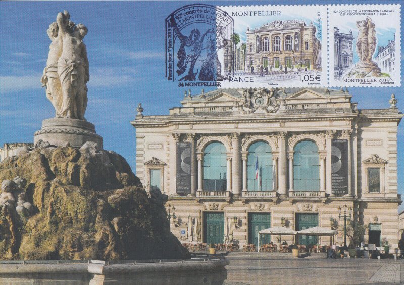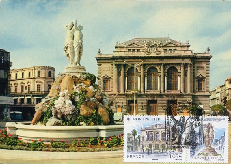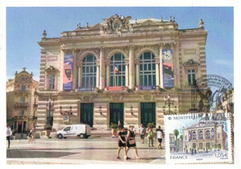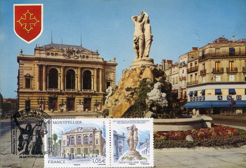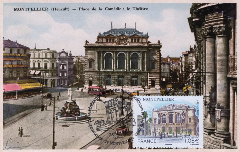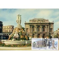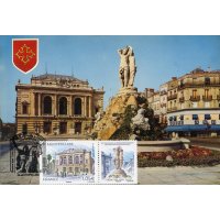 | Commentaire | Format de la vignette : 26 x 30 mm Le timbre représente l'opéra Comédie, situé place de la Comédie et ses terrasses de café emblématiques du lieu. La vignette représente la Fontaine des Trois grâces, déesses emblématiques de Montpellier. Statue en marbre désormais située à l'intérieur de l'opéra Comédie. Elle est classée au titre des Monuments Historiques. L'Opéra Comédie, grand théâtre à l'italienne est l'oeuvre de l'architecte Marie-Joseph-Cassien Bernard, dit Cassien-Bernard (oct.1848-fév.1926, élève de Jean Louis Charles Garnier, nov.1825-août 1898, architecte parisien). Il est inauguré en 1888, et remplace l'ancien théâtre détruit lors des incendies de déc.1785, de 1789 et d'avril 1881, avec une destruction totale. La façade : trois baies vitrées surplombant trois portes, un grand parvis, une horloge monumentale du sculpteur Jean-Antoine Injalbert, dit Antonin Injalbert (fév.1845-janv.1933), à l'origine, il y avait quatre statues représentant le Chant, la Poésie, la Tragédie et la Comédie. Sur la place centrale, est édifié la fontaine surmontée de la sculpture des Trois Grâces (1793). Les Trois Grâces : Aglaé, Euphrosine et Thalie, sont les trois Charités de la mythologie grecque, déesses de la séduction, la beauté, la nature, la créativité humaine et la fécondité. La fontaine, avec les trois Grâces et les putti (angelot nu et ailé) du sculpteur Étienne Dantoine (ou d'Antoine, fév. 1737-mars 1809) réalisée avec les marbriers de la carrière de Carrare, (Italie), est terminé en 1776, mais installée sur la place le 8 mai 1793, suite à un différent important avec la municipalité. La fontaine a été déplacée plusieurs fois, en fonction de travaux de voirie ; elle a également subit des restaurations, les Trois Grâces étant remplacées par des copies en résine (la sculpture originale étant déposée dans le hall d'accueil de l'Opéra), l'ultime transformation date de 2003, avec deux bassins superposés, des margelles de pierre avec rampe métal, des ruissellements et des jets croisés, et un éclairage particulier, la mettant en valeur. En savoir plus sur Wikipédia : Montpellier |